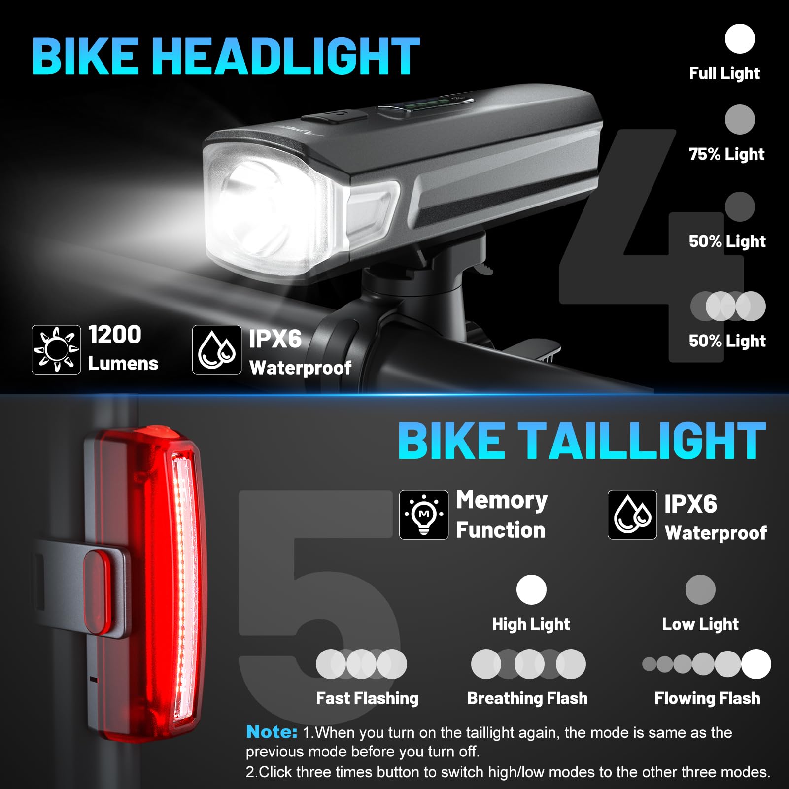 - Strong Brightness: 1200 lumens super brightness bike headlight and a brighter bike tail light provide a increased visibility and safety for night riding. IPX6 waterproof function allows you to ride with confidence even in rain or snow