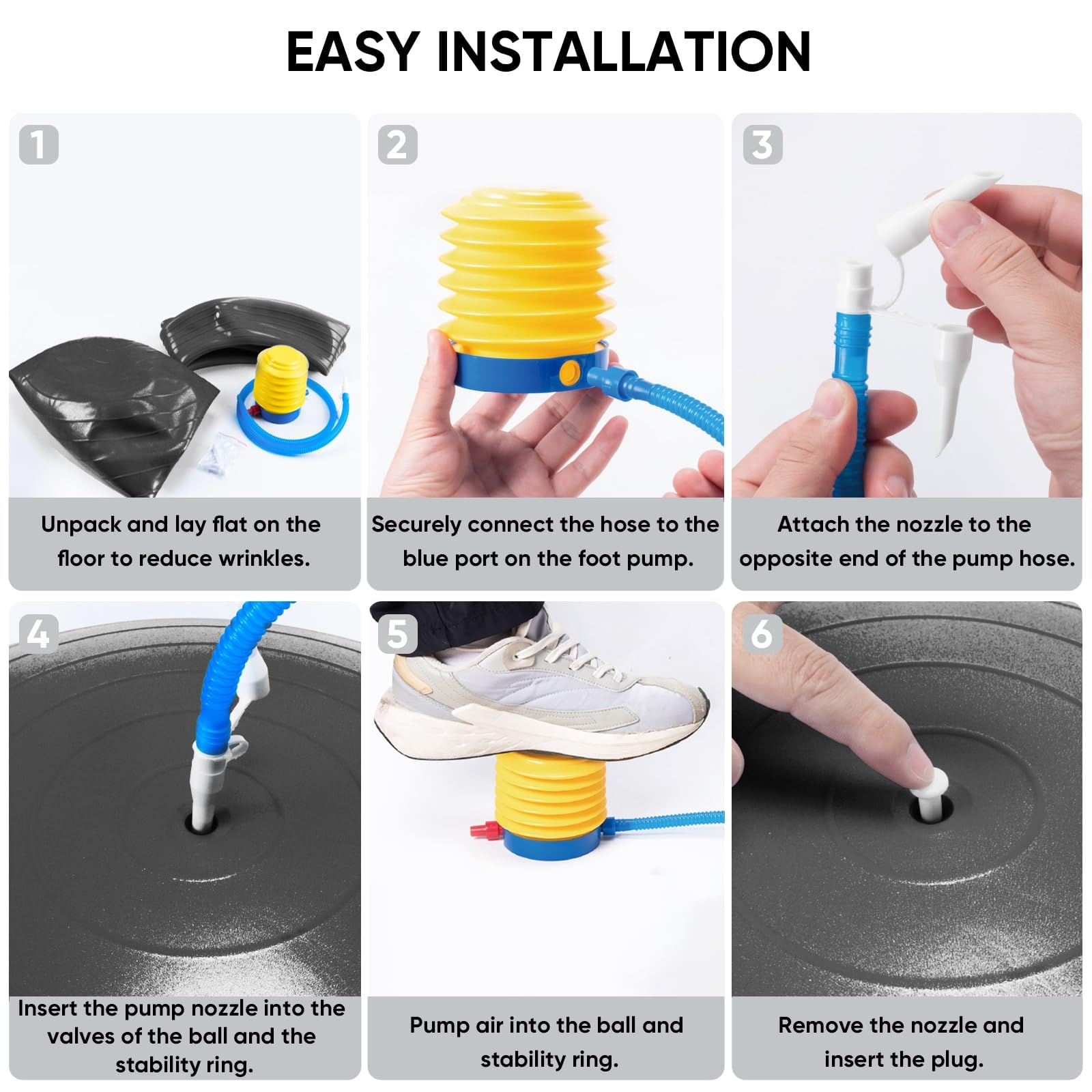 - Easy to Inflate & Portable: This stability ball chair is easy to inflate with the included pump; It's portable and can be easily put into your bag to take anywhere, making it a convenient fitness accessory for home, office, traveling, or gym use; NOTE: Do not overinflate, as it may cause localized bulging