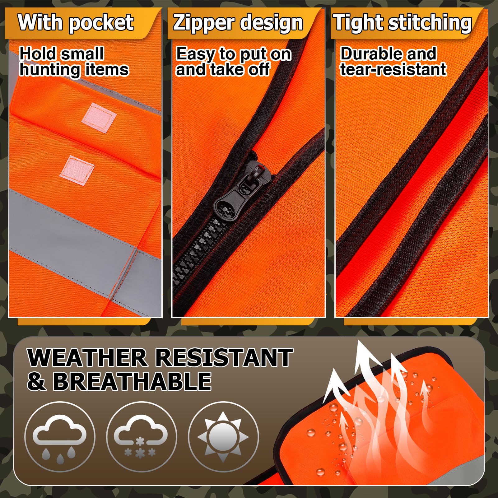 - HIGH-QUALITY HUNTING VEST: Made from premium materials, this blaze orange hunting vests are tear-proof, breathable and lightweight. The zipper design allows for easy on and off, while two three-dimensional pockets offer practical storage for communication devices, enhancing convenience.