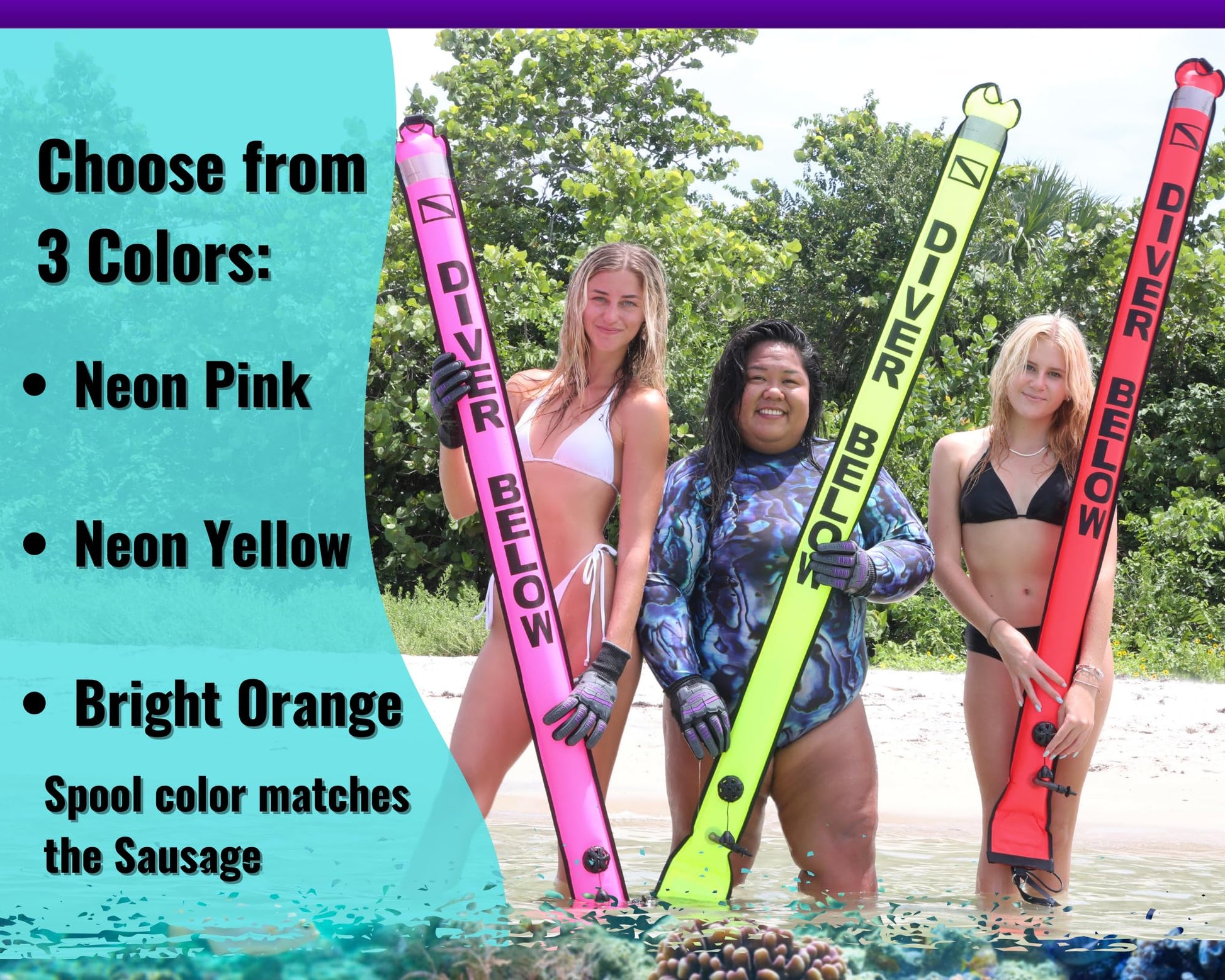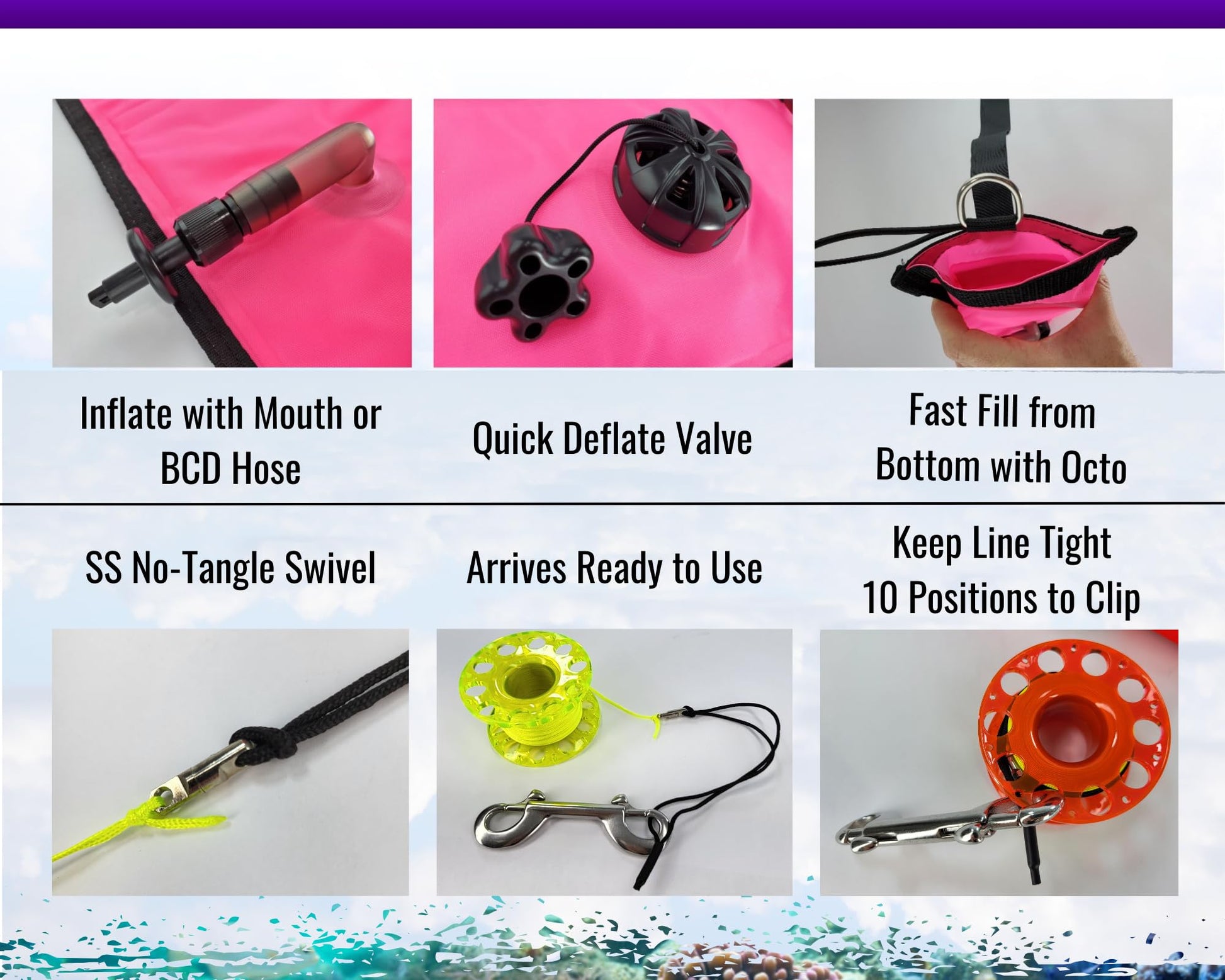 Aquatic Hunt 3 Piece Set = 6ft (1.83M) Safety Sausage (SMB) + 4" SS Clip + 100ft (30M) Finger Reel/Spool (Yellow)