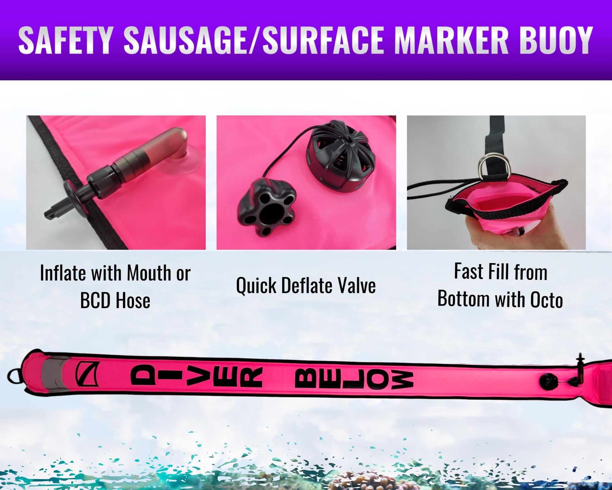 Details: Be seen over the waves with our 6ft Safety Sausage / Surface Marker Buoy (SMB), designed for maximum visibility and ease of use in any water condition. Measuring 6ft in length and 6in in diameter, this buoy features reflective tape across both sides of the top to ensure you stand out, even in low light. Engineered with versatility in mind, it offers two convenient filling methods: inflate through the weighted bottom using an Octo/Aux Regulator or quickly fill by mouth through the valve. When it’s time to pack up, simply use the pull string dump valve to easily empty the buoy and secure it with the bungee band and hook-and-loop strap for a neat roll-up. With a lifting capacity of up to 20 lbs, this durable, high-performance surface marker is an essential safety accessory for divers, kayakers, and boaters alike.