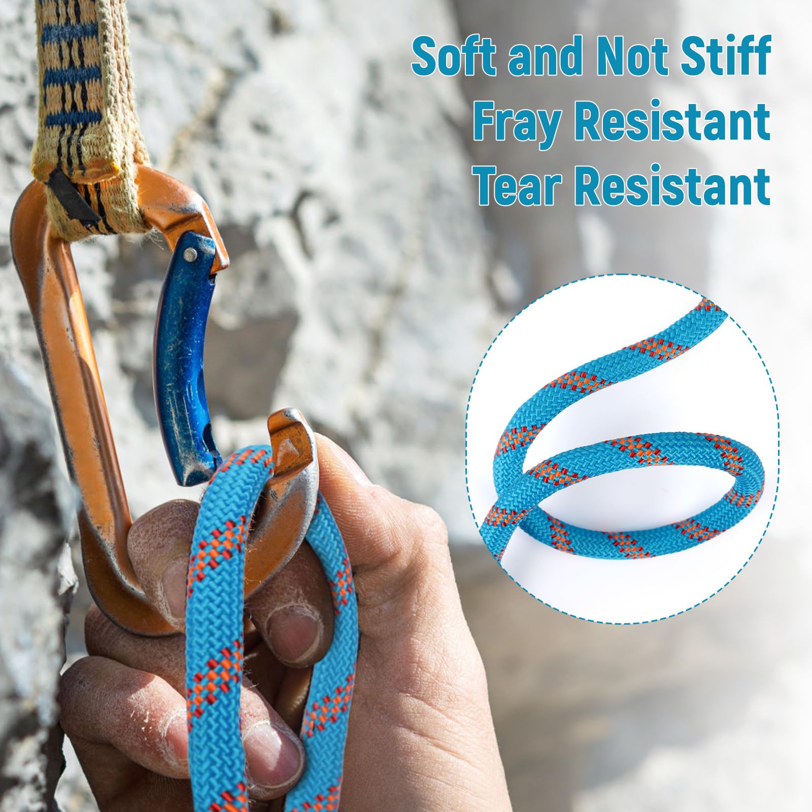 - 【Exceptional Durability】Our climbing rope is made from high-quality polyester, ensuring climbing rope can withstand heavy loads and harsh conditions, maintaining its strength and flexibility under outdoor elements such as wind, rain, and sunlight.