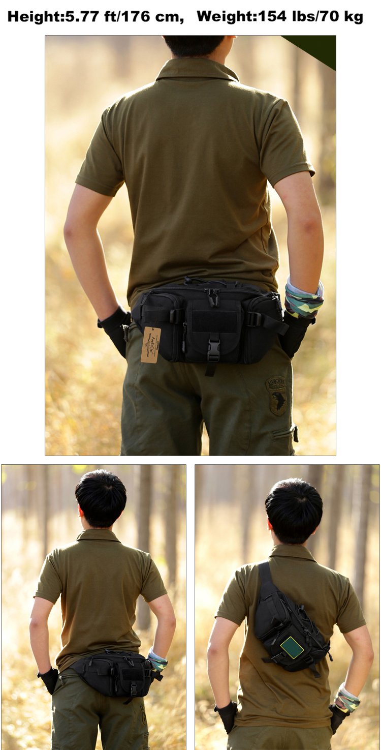 Waist Bag which can carry lots of belongings like cell phone, MP3, glasses, tactical flashlight, compass, kettle, cigarette, snacks, umbrella etc. The zippered BACK POCKET is hidden for extra protection about your passport, ID card, Credit card, wallet and essential stuffs.MOLLE external expansion system designed to be used in combination with other equipment, you can load pockets, water bottle bag, accessory kits and other .