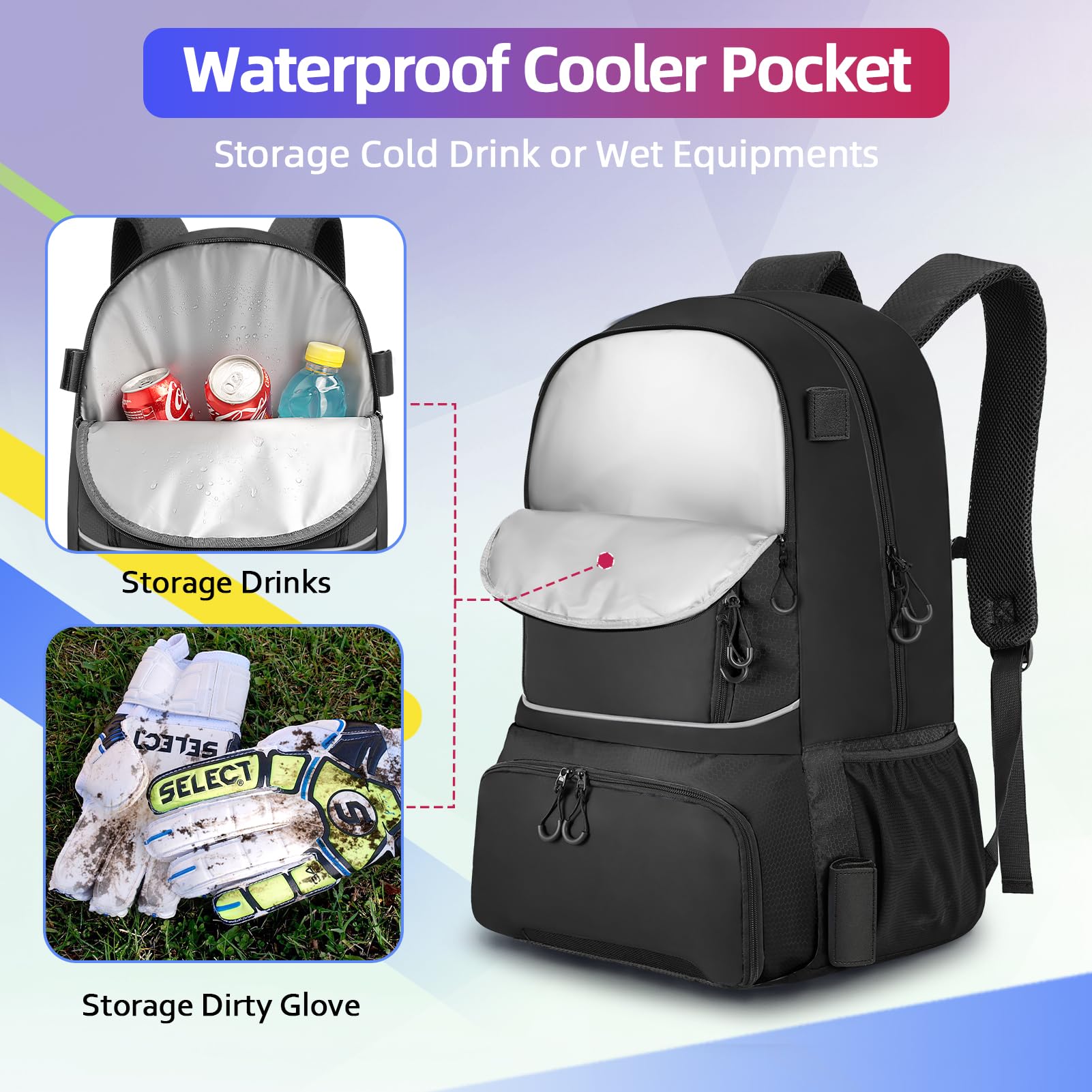 - Structural Features: Lacrosse backpack includes an insulated waterproof compartment and a ventilated cleats compartment. The insulated compartment keeps beverages fresh for hours or holds damp clothing and towels, ensuring the dryness of other compartment contents. The shoe compartment is designed for sneakers, equipped with ventilation holes to prevent odors. The interior utilizes polyester fiber material that can be pulled out for easy washing, simplifying maintenance