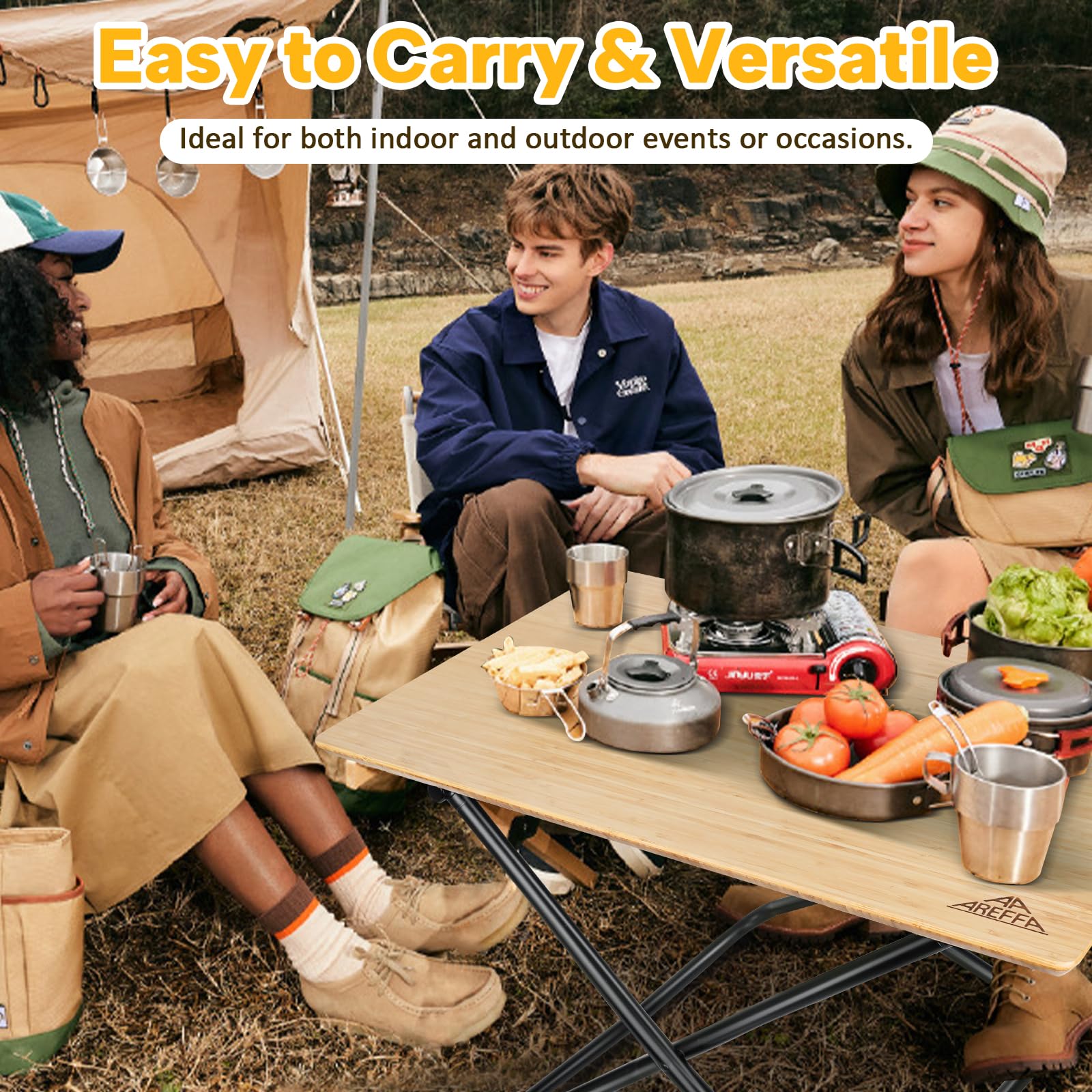 - [Natural Bamboo Folding Tabletop] Areffa folding camping table features a natural bamboo surface that’s eco-friendly, water-resistant, and scratch-resistant. Ideal as a bamboo picnic table or camp kitchen table for outdoor meals.