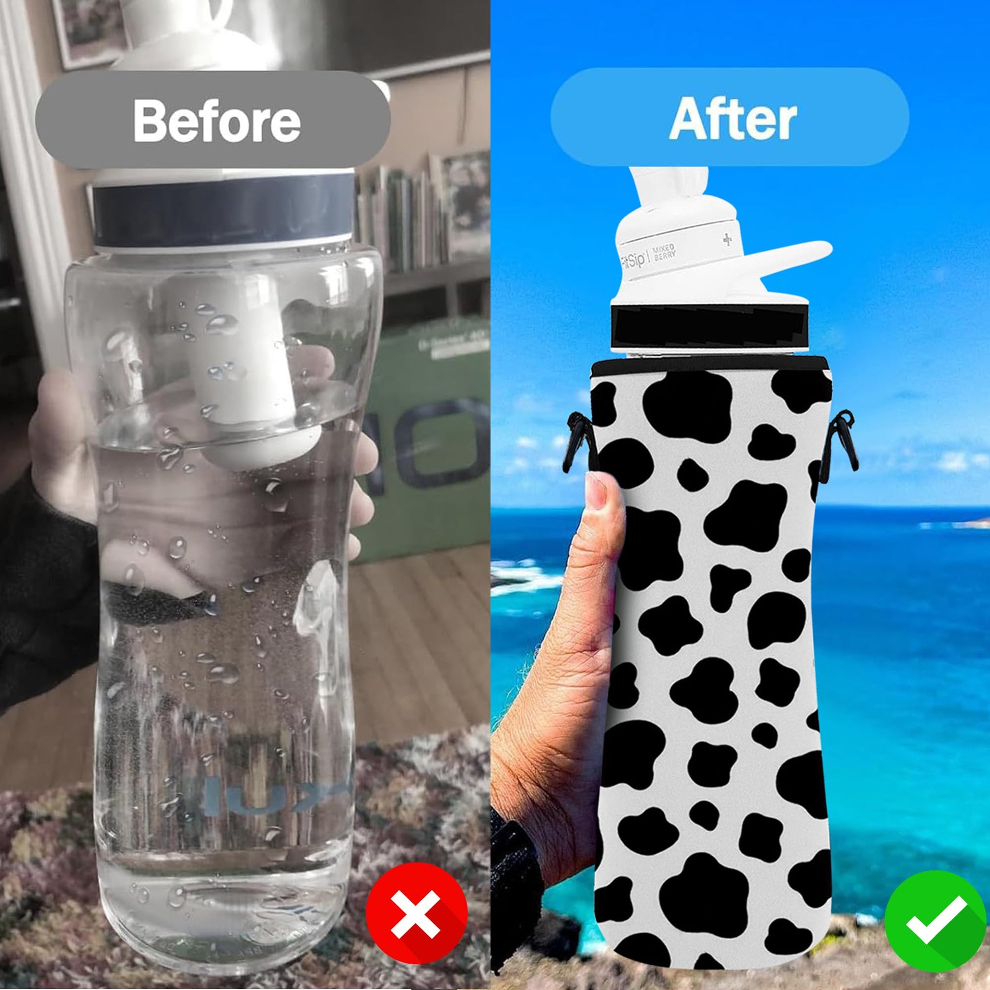 - Cow and Black Design: You will get 2pcs different bottle sleeves- 1 piece cow themed design printed and 1 piece solid black color. They are compatible with 32 oz bottle.