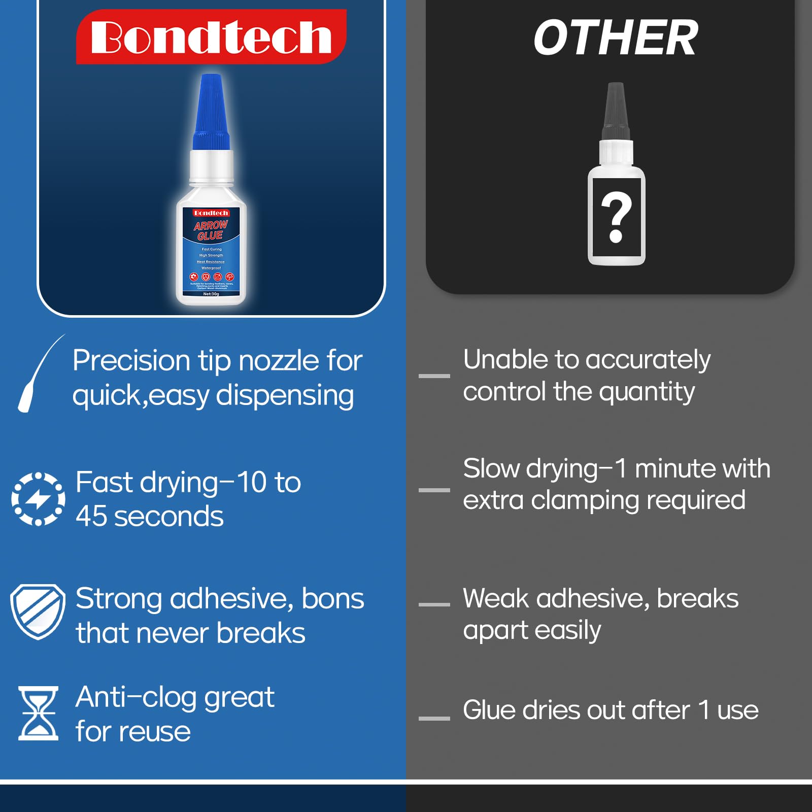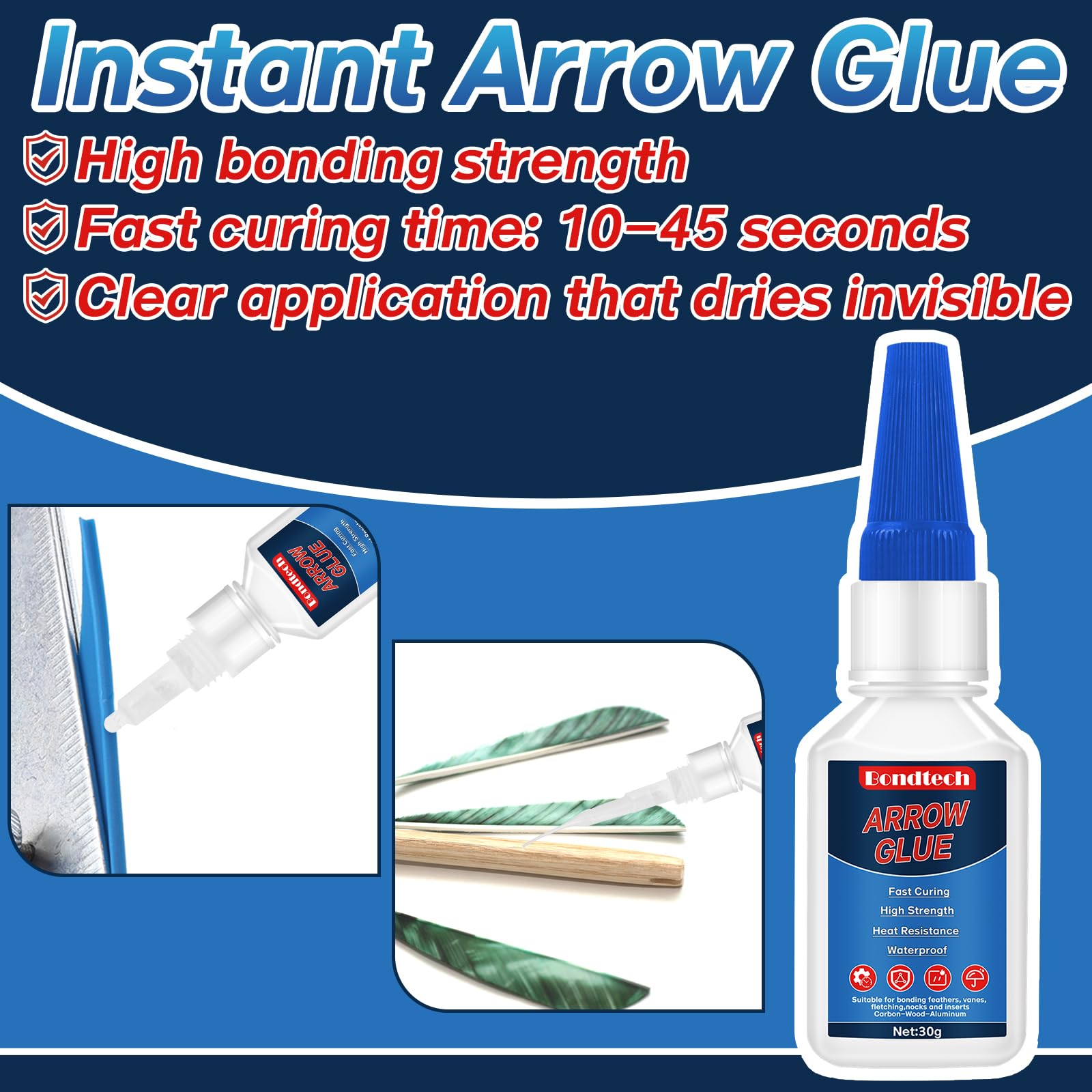 - Instant Arrow Glue: Our arrow glue have been tested to be super strong for all bonding processes that require a fast, strong bond, won't harden or become brittle over time, so their performance and ease of use make them ideal