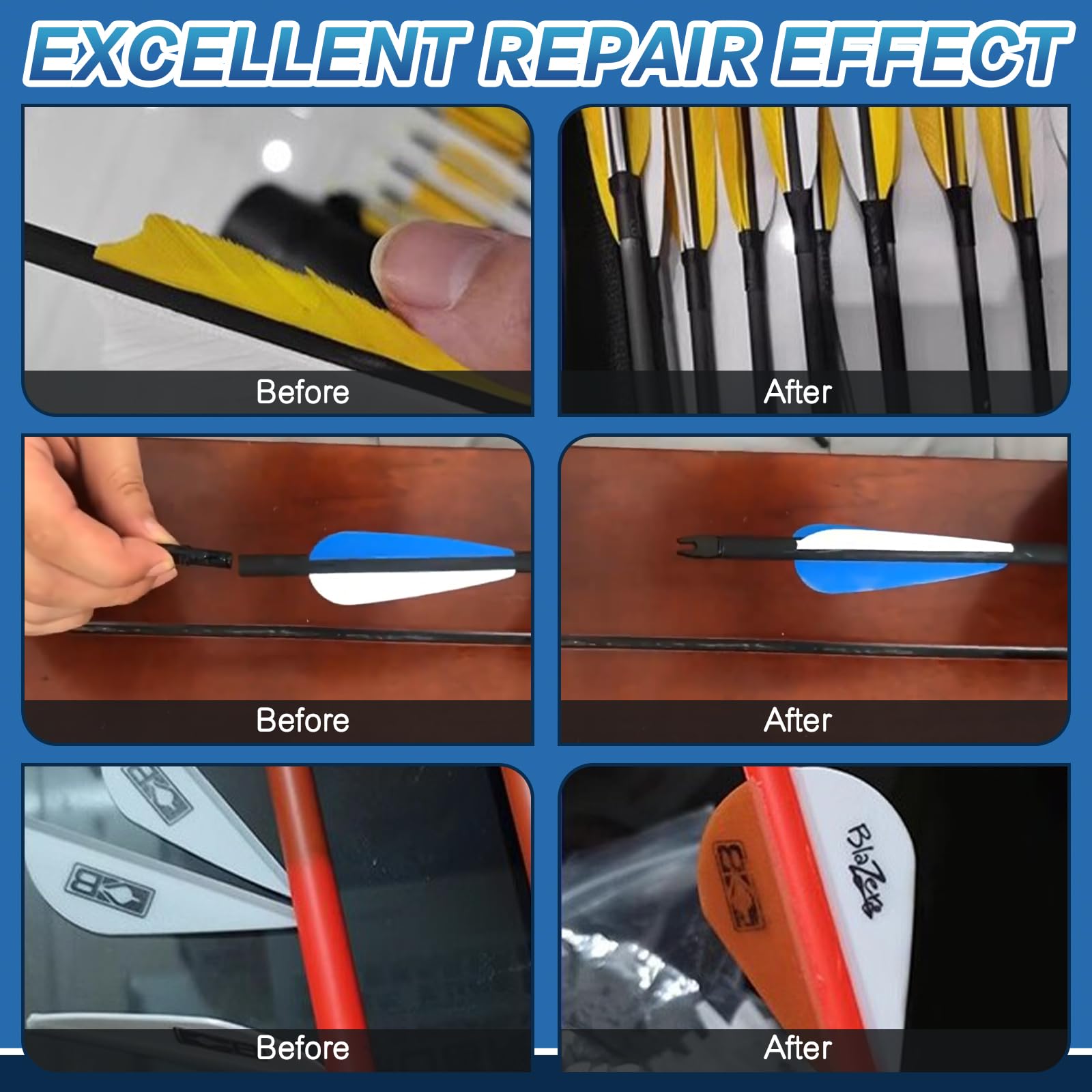 - Easy to Use: Keep the repair surface clean and dry before use. After applying the clear fletching glue, press and hold both repair surfaces for 45 seconds for initial curing. Wait 24 hours for optimum bonding