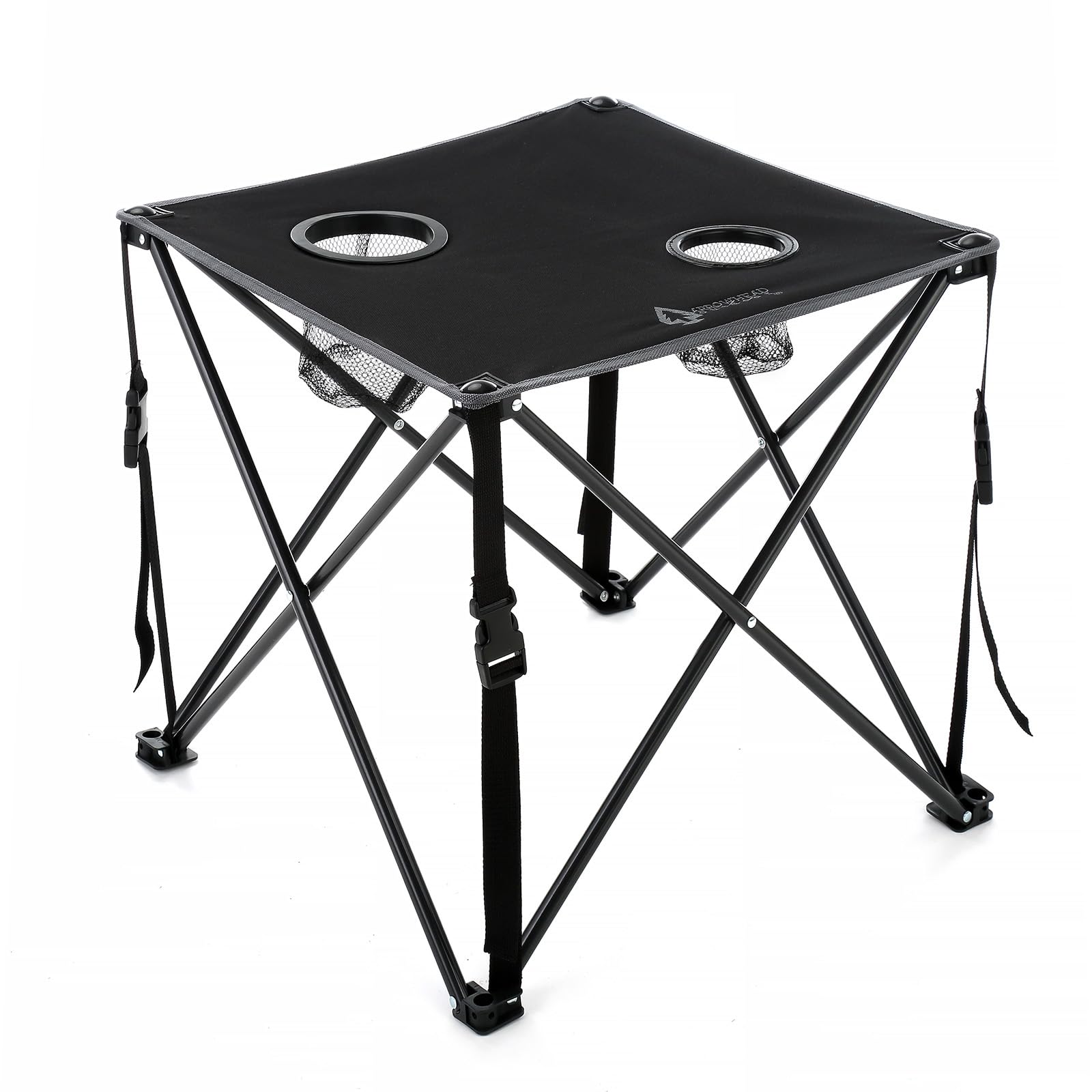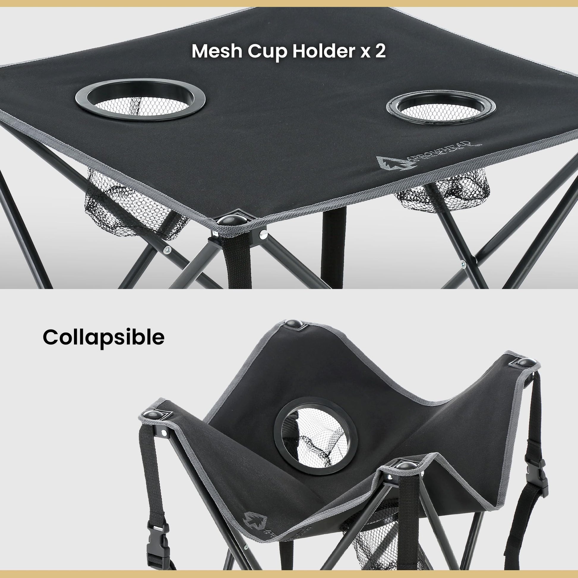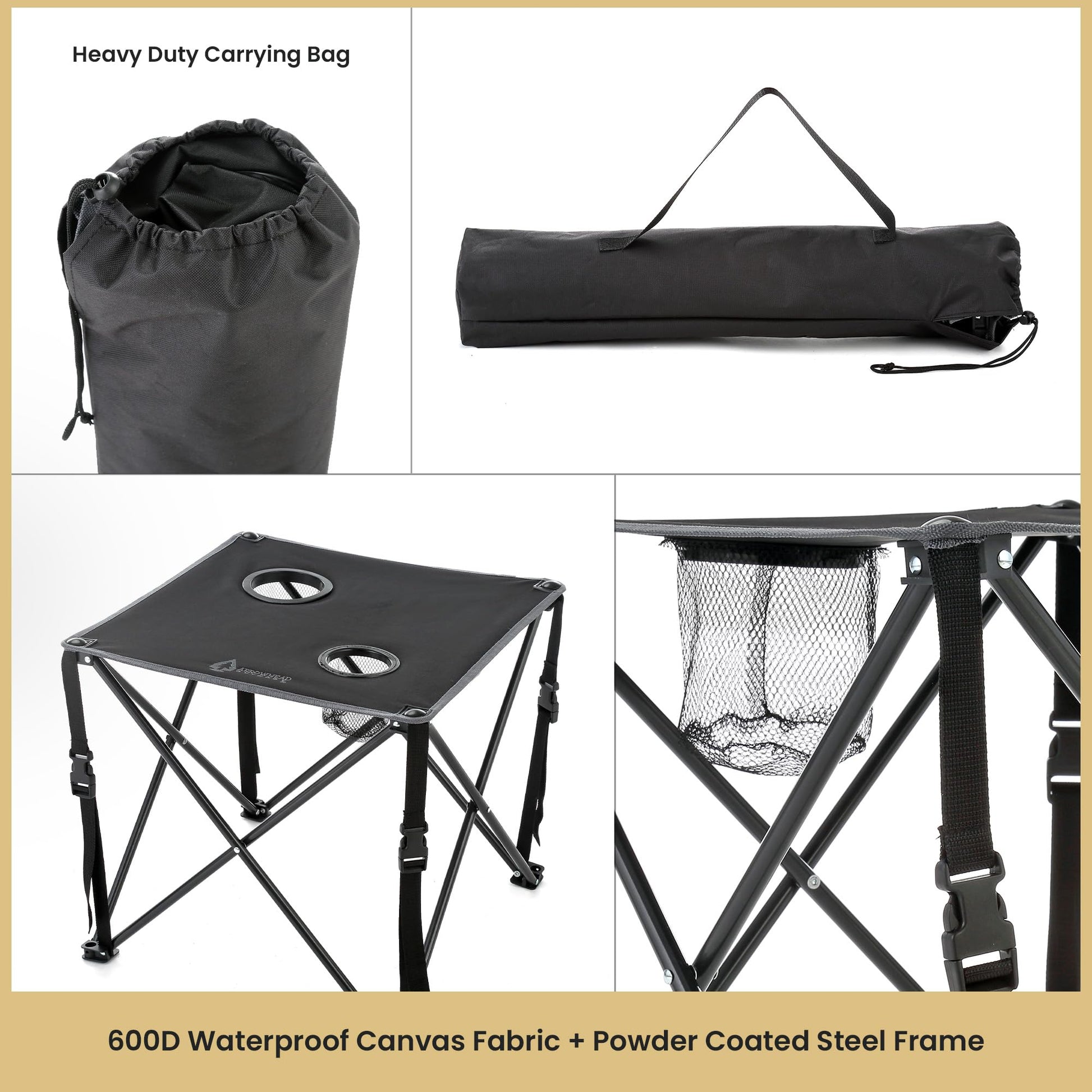 - [HEAVY-DUTY SOLID CONSTRUCTION] – Heavy-duty steel frame construction with rugged 600D canvas fabric. Measures 18.5”L x 18.5”W x 18.5”H when setup (table top spans 24” diagonally).