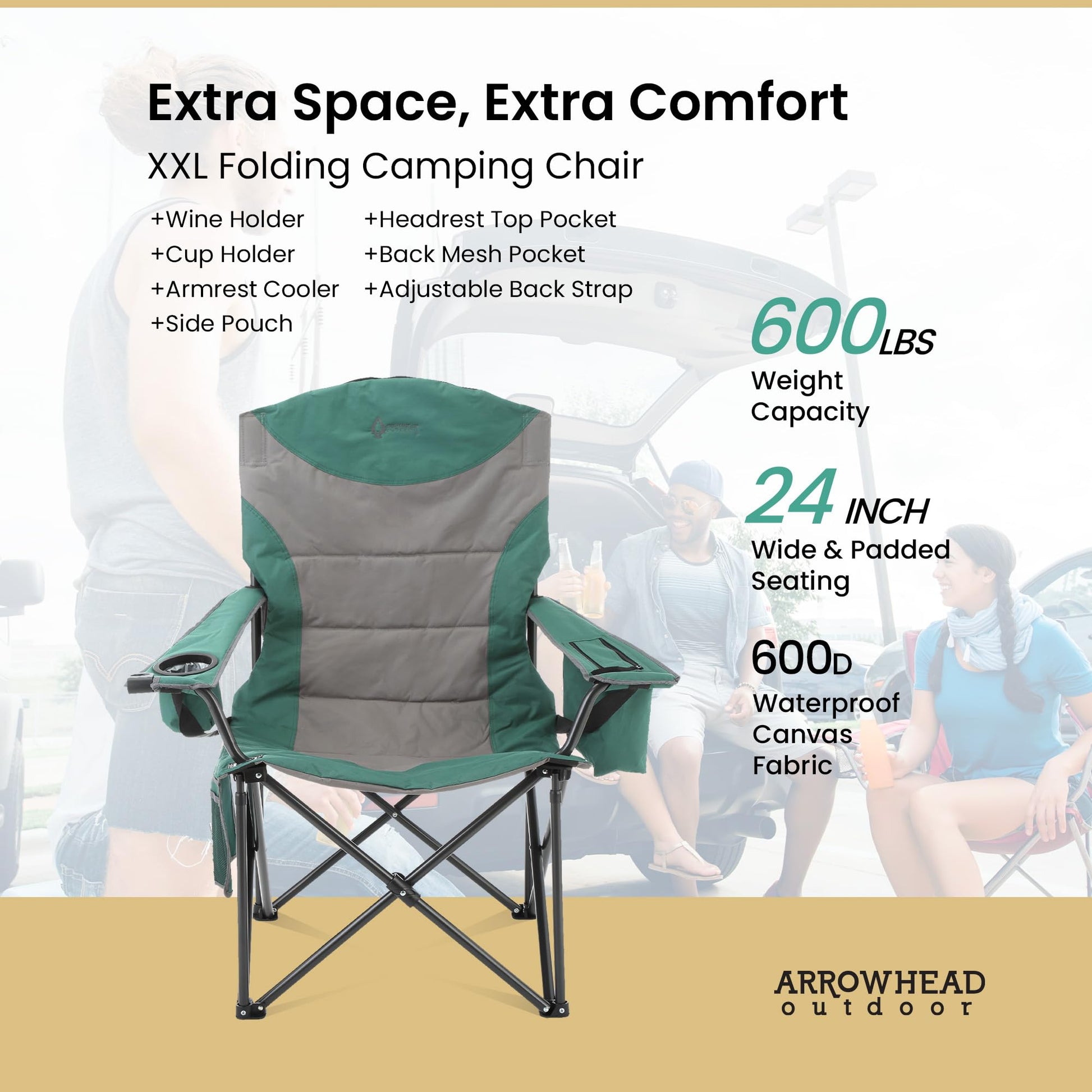 ARROWHEAD OUTDOOR Oversized XXL Portable Folding Camp Chair w/Glass & Cup Holders, Armrest Cooler, Heavy Duty Carry Bag, 600 lbs Weight Capacity