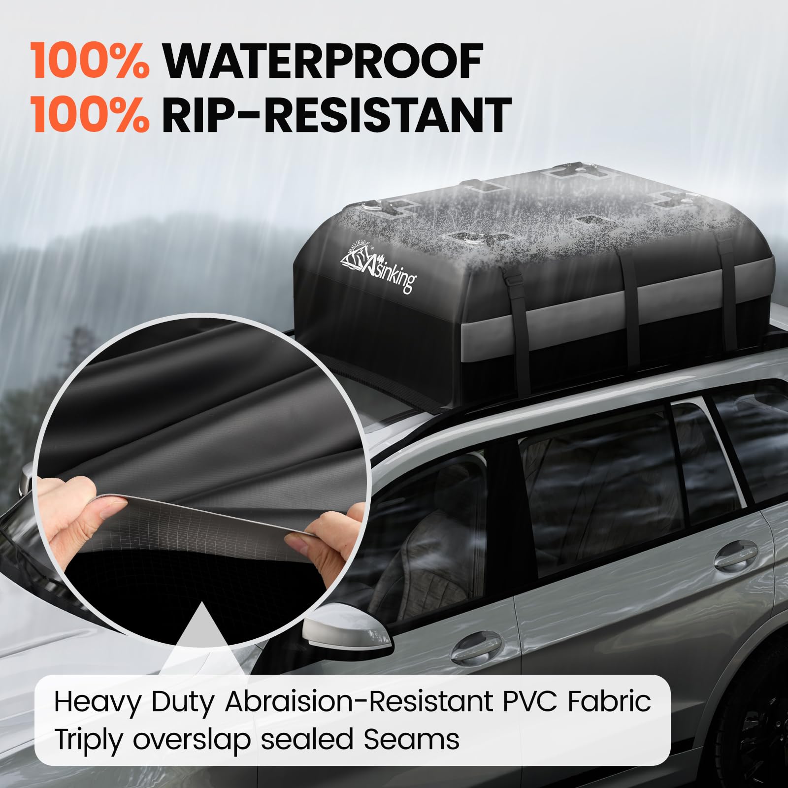 - γπππππππΌπππΏ ππππ ππΌπππ πππΌππ ππ πππ πππΌπΏγBased on 10 years of exploration and 1,000+ quality improvements across 15+ series of car roof bag, we could proudly promise our Asinking roof rack cargo carrier bag is 100% rip-proof and waterproof. Made from 900D abrasion-resistant PVC and featuring triply reinforced heat-welded seams and strong zipper, it makes your luggage from downpours and scratches, ensuring durability in harsh conditions.