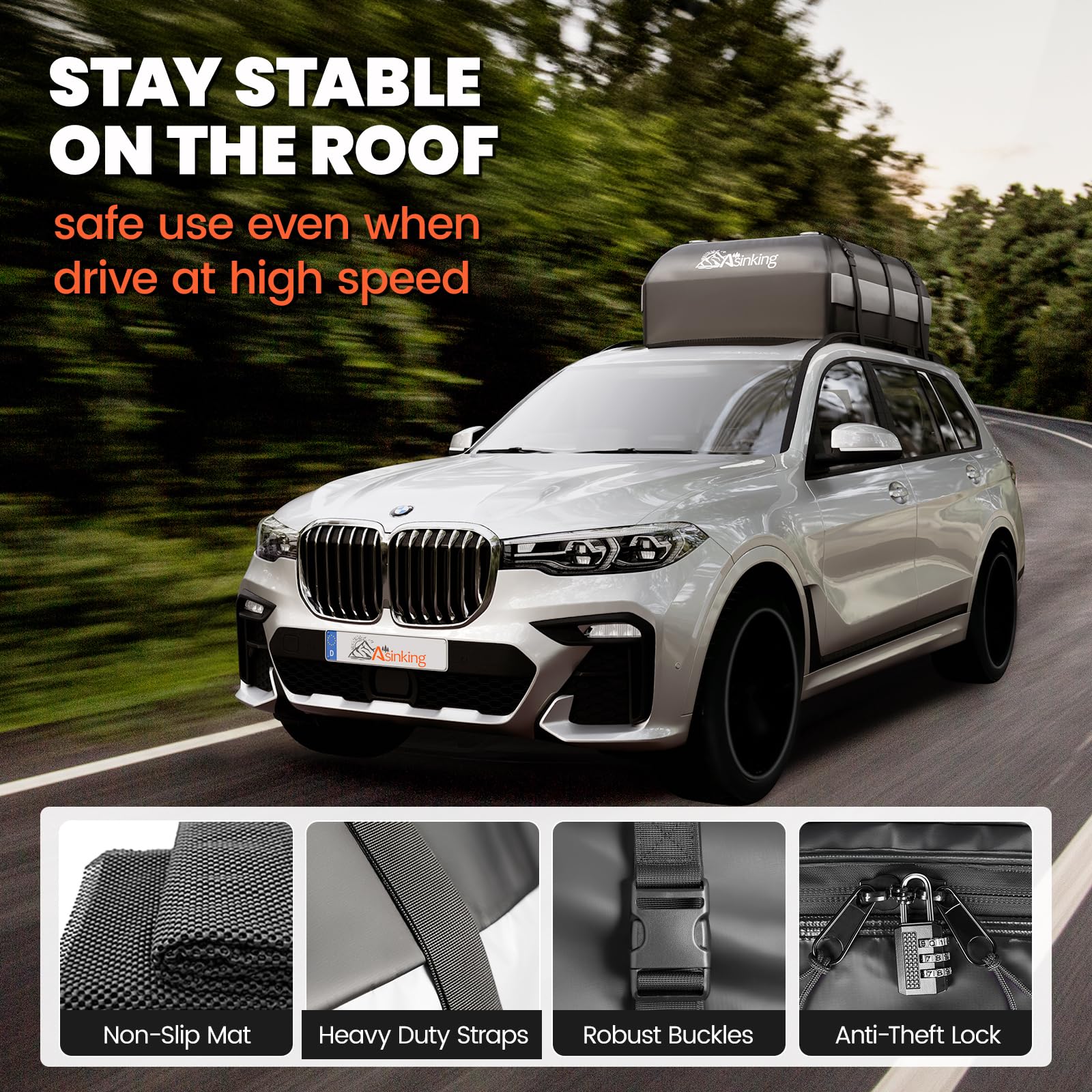- γπππ πππππΌπΏππΏ πππΌπππππ ππ ππππππ πππ πππΎπππππγAlways feel stressed with cargo bag when drive at high speed? Please assured, the Asinking car roof cargo carrier is completely upgraded with heavy duty straps and large buckles, to keep the car top carrier never moving even you drive at 70-80mph. Plus, the non-slip rubber mat will help a lot. The bonus combination lock would safeguard your luggage while parking overnight.