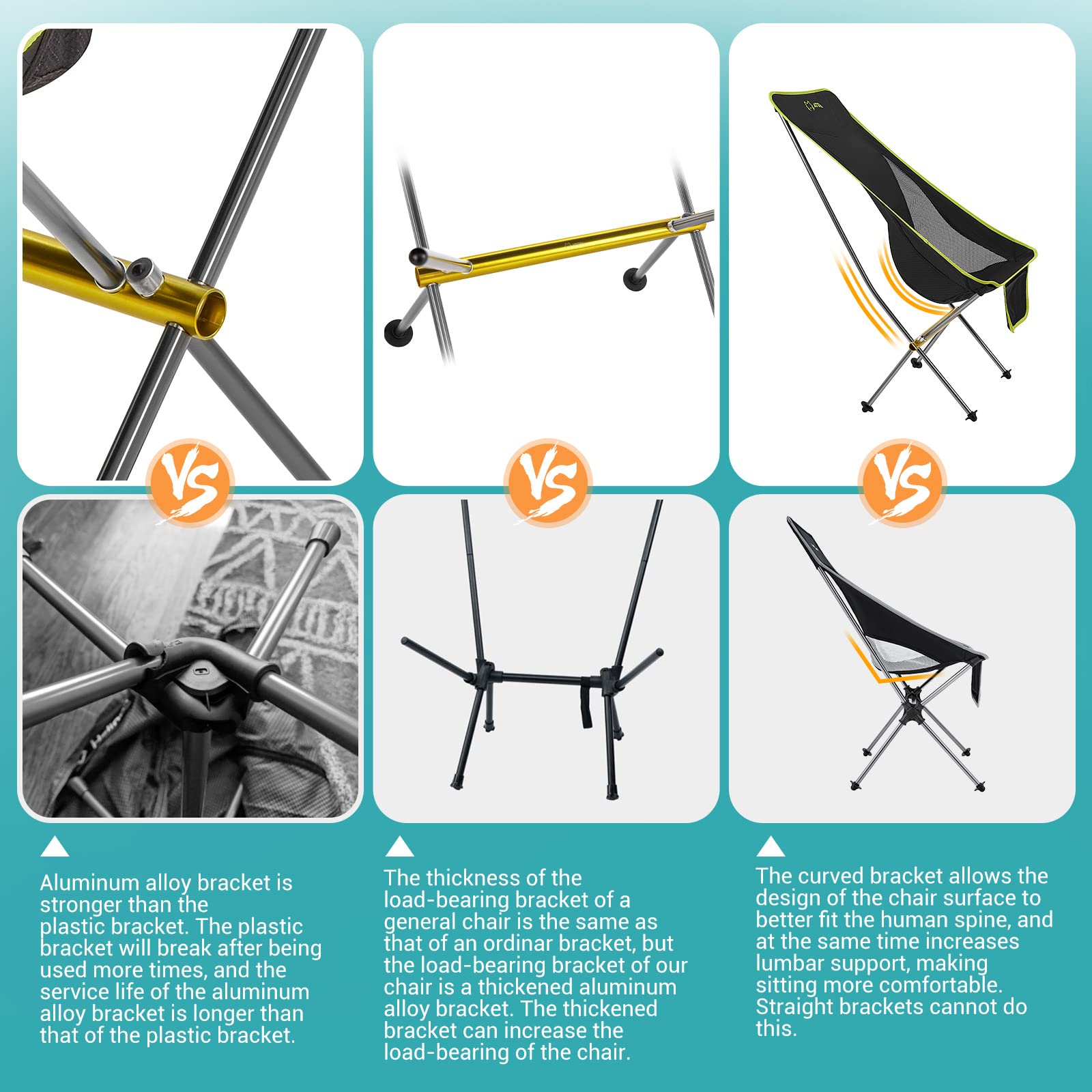 - 【Comfortable Camping Chair】ATEPA camp chair has high back, padded headrest and back support with an ergonomic design.High back can supports the upper body,providing a comfortable posture that prevents backaches or strains than low back camp chair.Fully support your head by a horizontal tube and Double-layer fabric with cotton on the head position, so you can rest your head and neck comfortably.