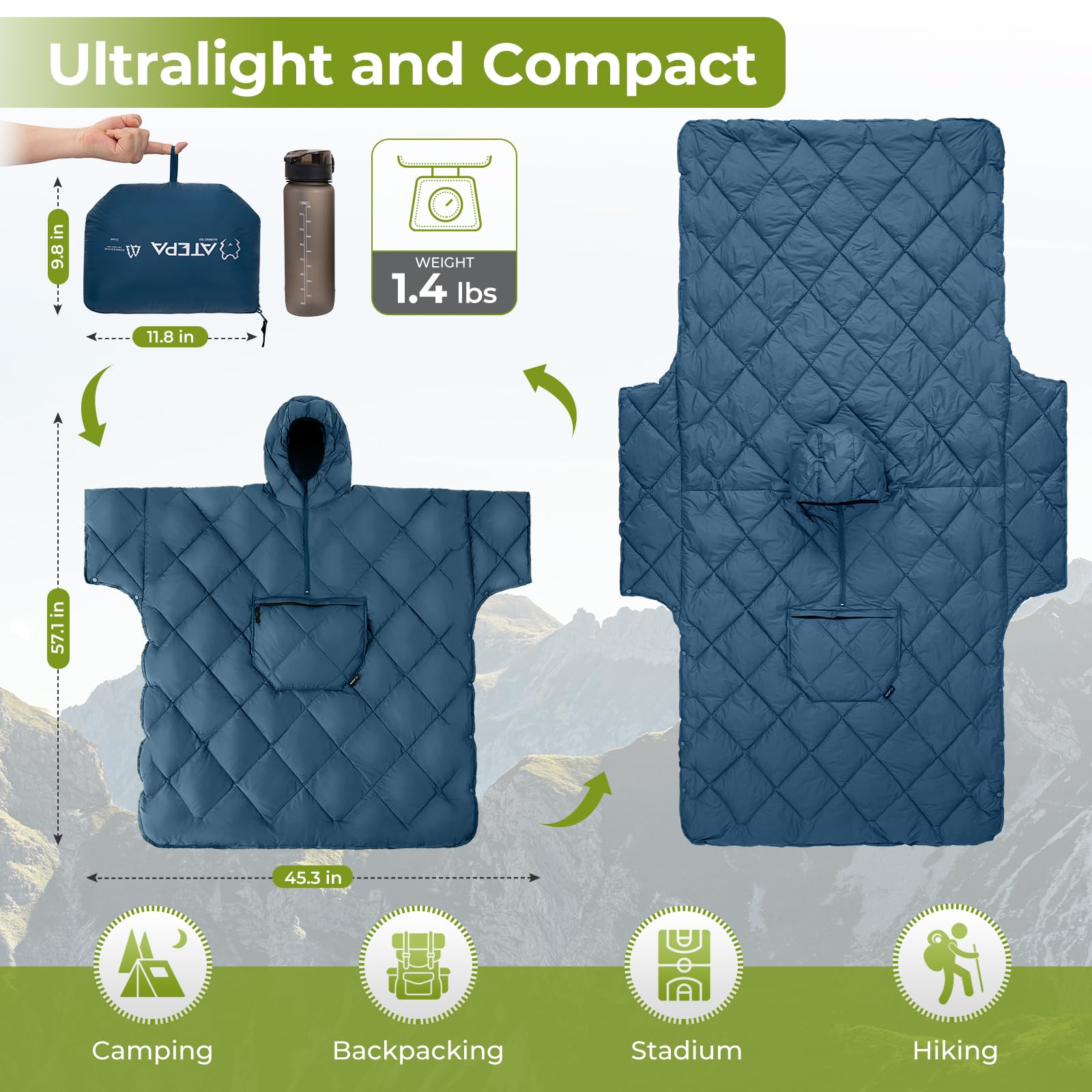 - ULTRALIGHT PORTABLE & PACKBLE: Take convenience wherever you go with a lightweight design that packs down to 11.8"× 9.8"× 5.9" . The stadium sack can be packed into its own kangroo pocket that minimizes bulk, this down alternative blanket is perfect for backpackers and travelers seeking efficient, space-saving warmth. This poncho measures 57.1"L × 45.3"W and only weighing 1.4 pounds - 56% lighter than traditional camping blankets. Backpackers save 38% pack space vs bulkier alternatives