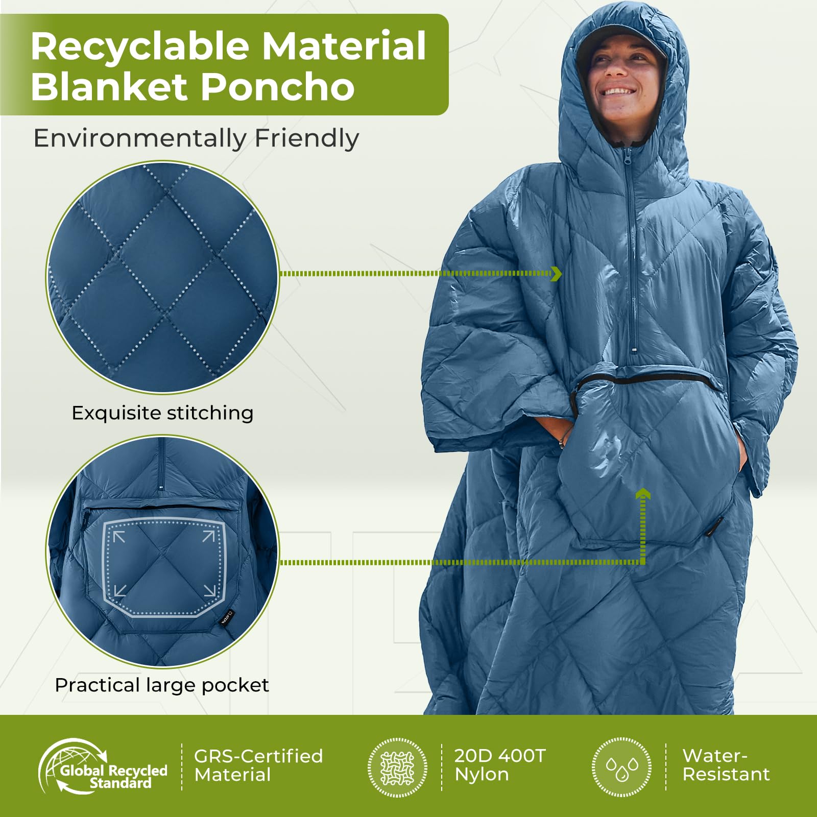 - ECO-FRIENDLY & RECYCLED MATERIALS: Crafted with sustainability in mind, this stadium blanket features recycled 350G of renewable Down Alternative filling and a breathable 20D 400T high-density nylon shell. These eco-friendly materials not only help protect the planet but also provide advanced insulation and durability, making your outdoor adventures greener and smarter