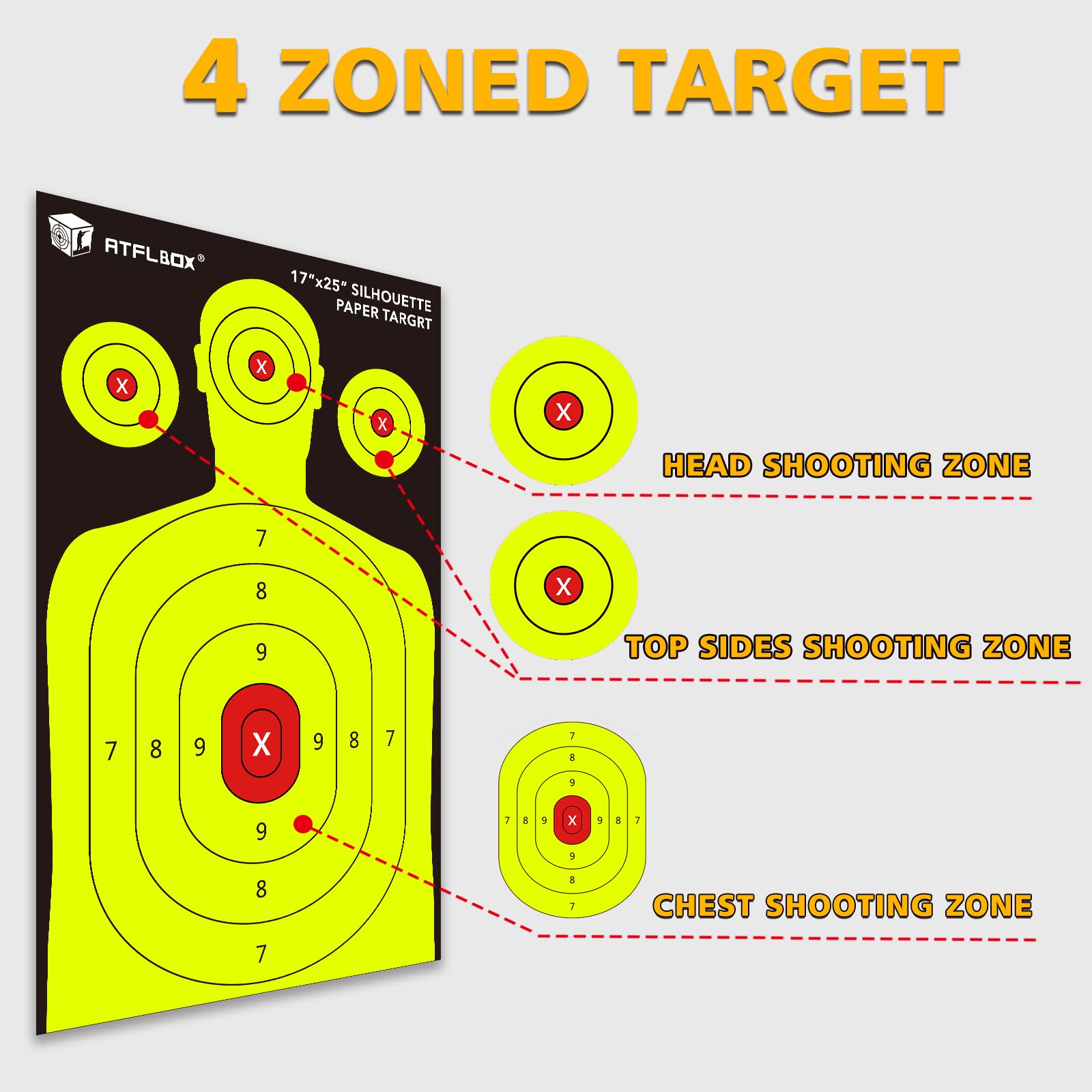 - FUNCTIONAL DESIGN: There are 50 paper targets featuring detailed silhouettes of people in both the head and torso shooting zones to improve your shooting skills. Designed to improve accuracy and skill at all levels of shooting, these targets provide challenge and growth for beginners and experienced shooters alike.
