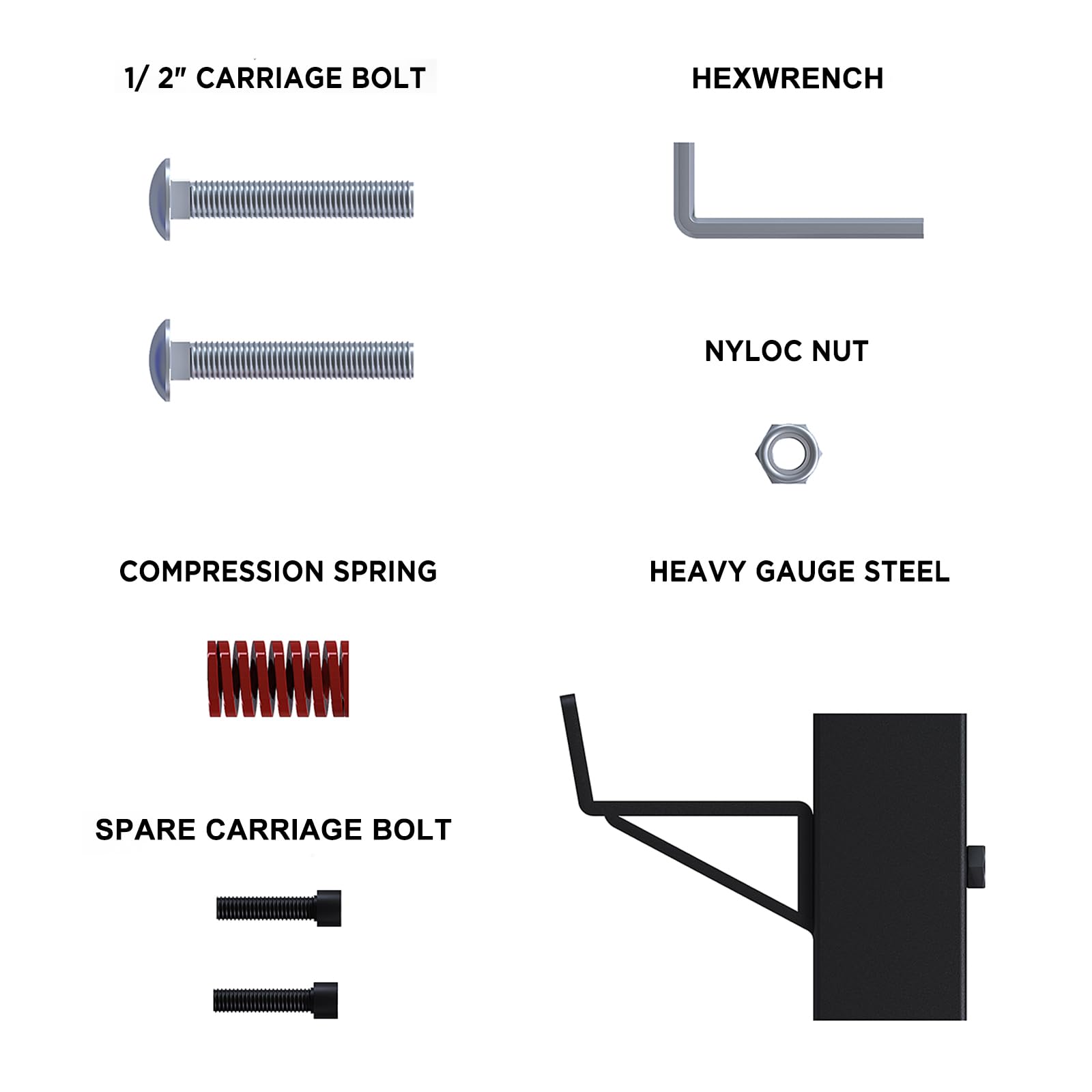 - (2x)Package Includes 2 X 1/2'' carriage bolt and Stopnut, Stopnut, Fastening bolts, Compression Spring and Hex wrench included, The extra carriage bolts allow for the occasional hit on the round head of the screw resulting in damage that you can replace immediately without having to look for a purchase.
