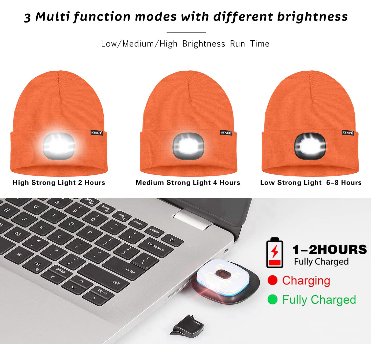 ATNKE LED Lighted Beanie Hat,USB Rechargeable 4 LED Running Headlamp Bright Cap with The Light Gifts for Men and Women/#Bright Orange