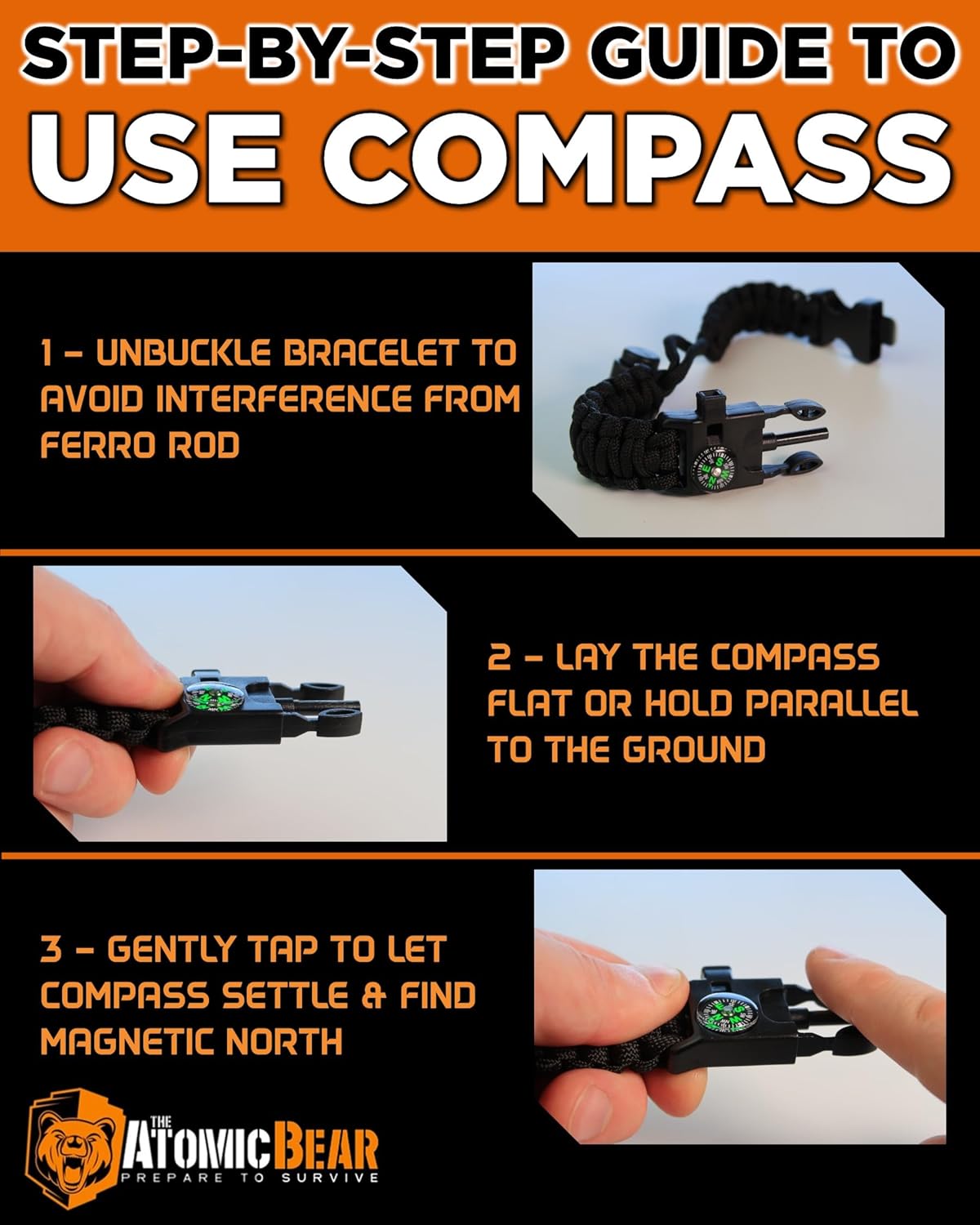 - GET ORIENTED & STAY ON COURSE - Make sure you know where to go and how to get back with the easy-to-read compass by adding these survival bracelets to your hiking essentials, camping stuff & hunting gear or fishing equipment
