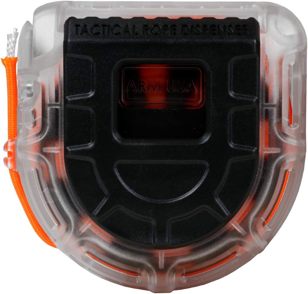 - 50ft Pre-Loaded Paracord Rope Dispenser. Built in Cutting blade, versatile belt clip, cord grip, view port, integrated attachment rail and Ruler.