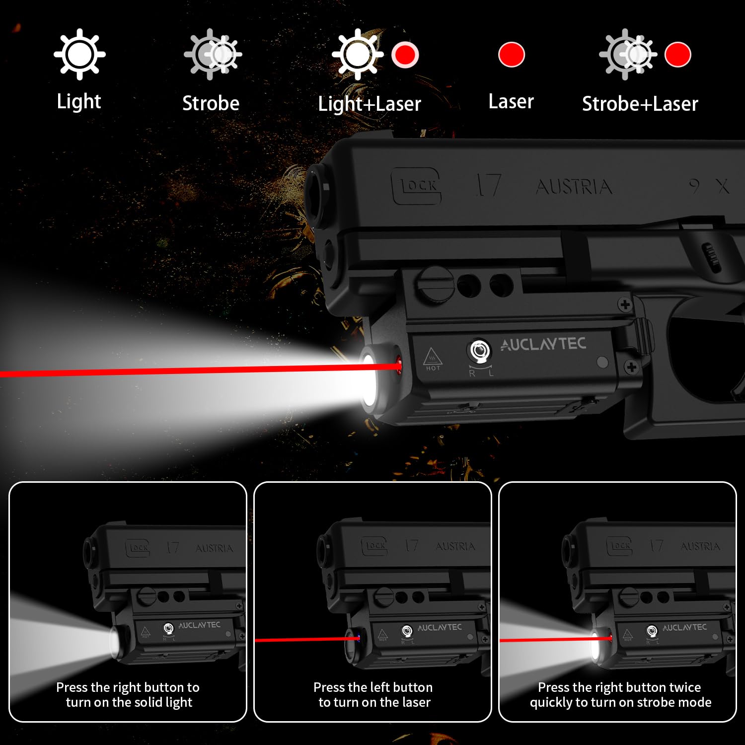 AUCLAYTEC 450 Lumen Pistol Flashlight Red Beam Laser Light Combo Gun Light, Compact Pistol Laser Flashlight Combo USB-C Rechargeable Tactical Flashlight for GL or Picatinny Rail