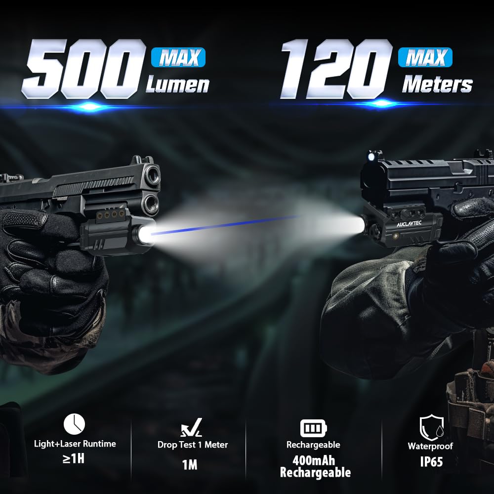 AUCLAYTEC Pistol Light Laser Combo with USB-C Charging, 500 Lumen Blue Beam Sight Tactical Flashlight for Subcompact Compact Pistol and Picatinny Rail