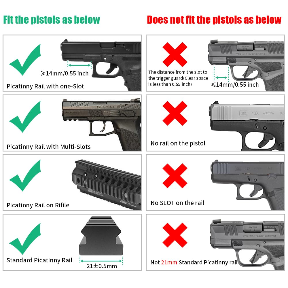 - Compact Compatibility: Four-hole adjustable rail offers your the best position; Tactical flashlight provides perfect fit with a variety of compact or subcompact handguns, Installation space(from the slot to the trigger guard)must be greater than 14mm