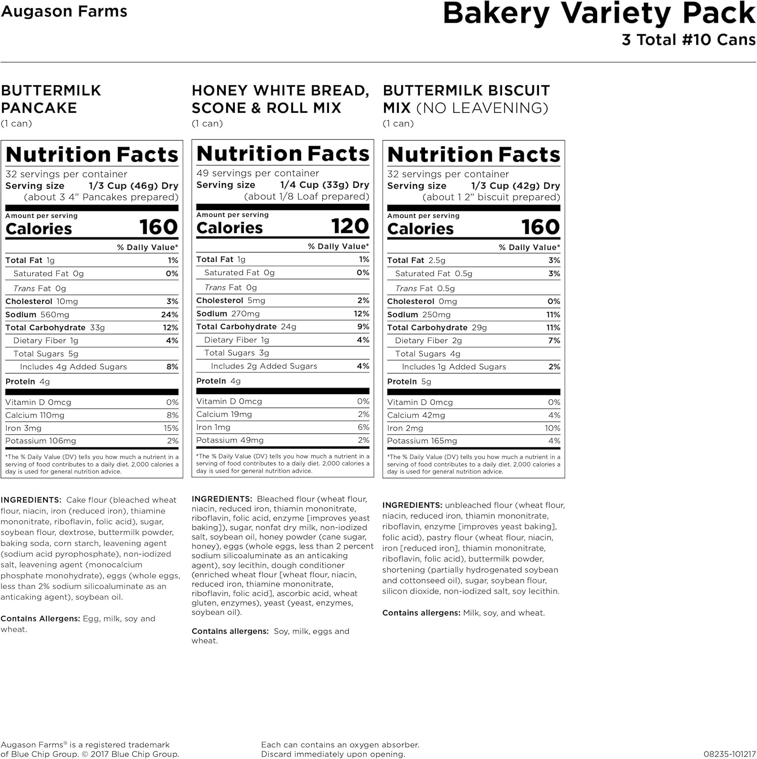 The Augason Farms bakery kit includes favorites to please any appetite for pancakes, bread, rolls or biscuits. Nothing is as pleasing as the aroma of fresh baked delights. So, keep them on hand. These are mouthwatering bakery items, designed for everyday use as well as for long term emergency food storage. Augason Farms bakery kit includes 113 servings in 3 institutional size (#10) cans with a shelf life of up 10 years. Please discard oxygen absorber after opening. Best when stored in a cool, dry and dark place at temperatures between 55° F and 70° F. Actual shelf life may vary based on individual storage conditions. Augason Farms recognizes that today's consumers are more concerned than ever before about what kind of foods they eat, and want to provide their families with food that is safe and the best quality. Family owned and operated since 1972, Augason Farms believes that great taste is a tradition worth preserving. Crafted with a focus on taste and nutrition, their products are manufactured in-house to the highest possible standards.
