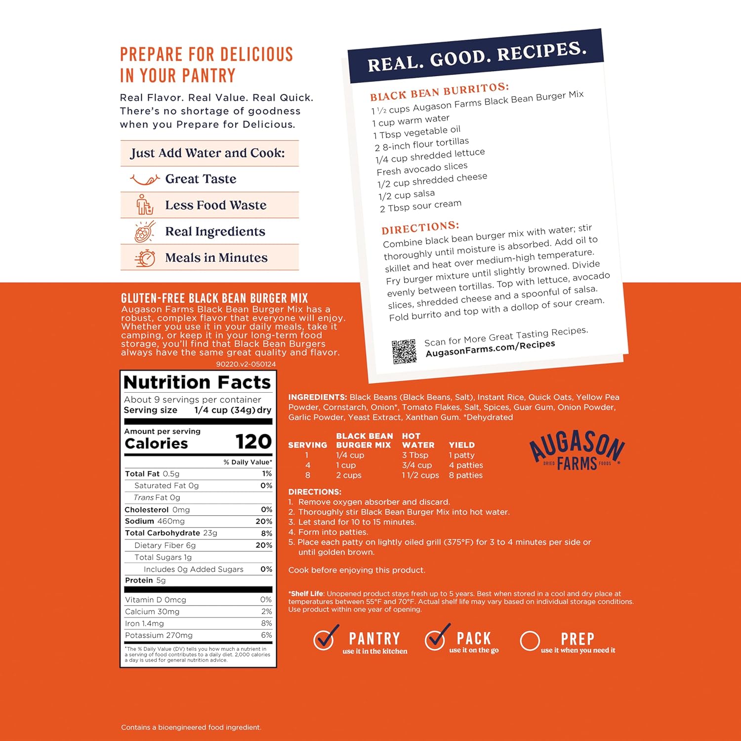 Being a vegetarian doesn’t mean your emergency food storage will be lacking in protein variety. Because black beans are a good source of protein, Augason Farms Gluten Free Black Bean Burger Mix is an ideal way to add protein to your long term food storage. It has a robust, complex flavor that even meat lovers will enjoy. Whether you use it in your daily meals, take it camping, or keep in long term food storage, you’ll find this Black Bean Burger Mix always has the same great quality and flavor. And, it’s certified gluten free.