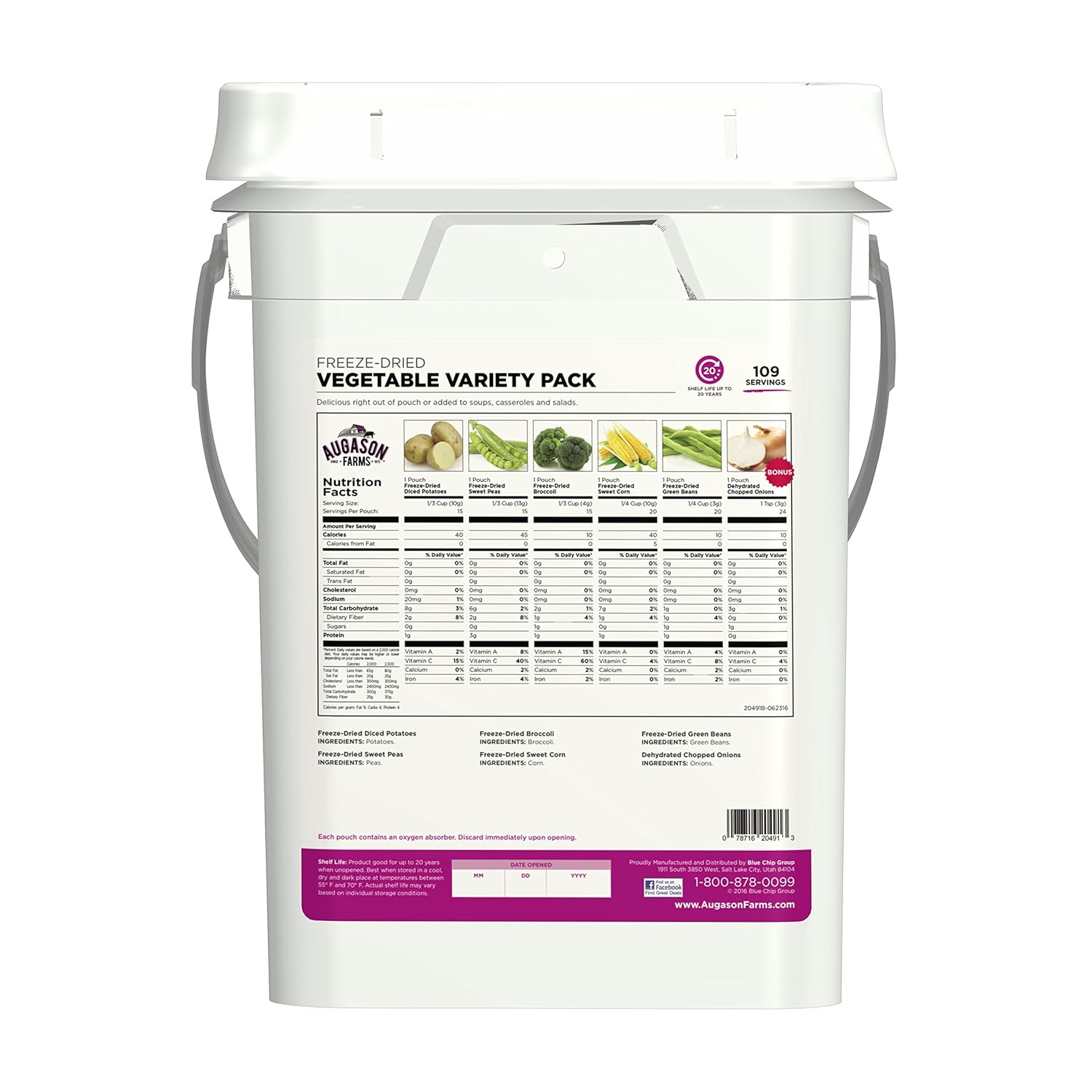 The Augason Farms Vegetable Variety Pack gives you a wide variety of healthy freeze-dried vegetables that are a nutritious staple for your family. You can toss vegetables into delicious stir fry or curries, blend into a fresh hot stew, prepare crunchy fresh salads and even whip up a savory side dish. The nutrition of the freeze-dried veggies is maintained giving them a long shelf life and they are ready to use when you want. With this kind of convenience, it's easy to see how this kit is also perfect for everyday use or long-term emergency food storage. The Vegetable Variety Bucket consists of 5 pouches of freeze-dried vegetables including 1 pouch sweet peas, 1 pouch diced potatoes, 1 pouch sweet corn and 1 pouch broccoli, plus 1 bonus pouch of dehydrated chopped onions. Pouches are contained in a 4-gallon watertight pail and includes 109 servings, 2,665 calories and a shelf life up to 20 years, making this an excellent choice for food storage, emergencies, survival, camping and everyday use. Whether enjoying Augason Farm's products for everyday meals, as an emergency food supply, or years down the road, you can be confident that Augason Farm. Make the wise decision and let Augason Farms' food essentials give you a peace of mind that's as indispensable as it is delicious. Best when stored in a cool, dry and dark place at temperatures between 55 DegreeF and 70 DegreeF.