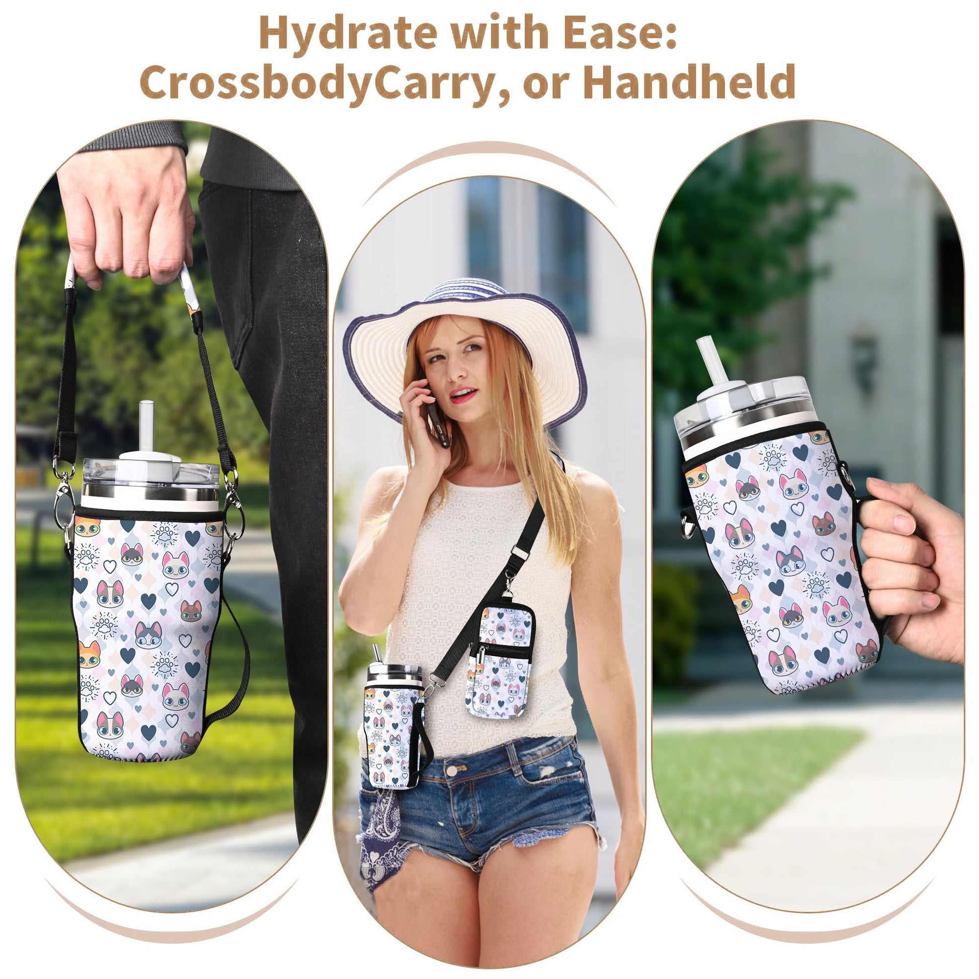 AUPET Water Bottle Holder Carrier Bag fit for 30/20 /14 oz Stanley Flowstate IceFlow Yeti Tumbler,Cup Accessories Sleeve Sling with Phone Pouch & Strap (Cute cat Heart, fit for Tumbler 20oz)
