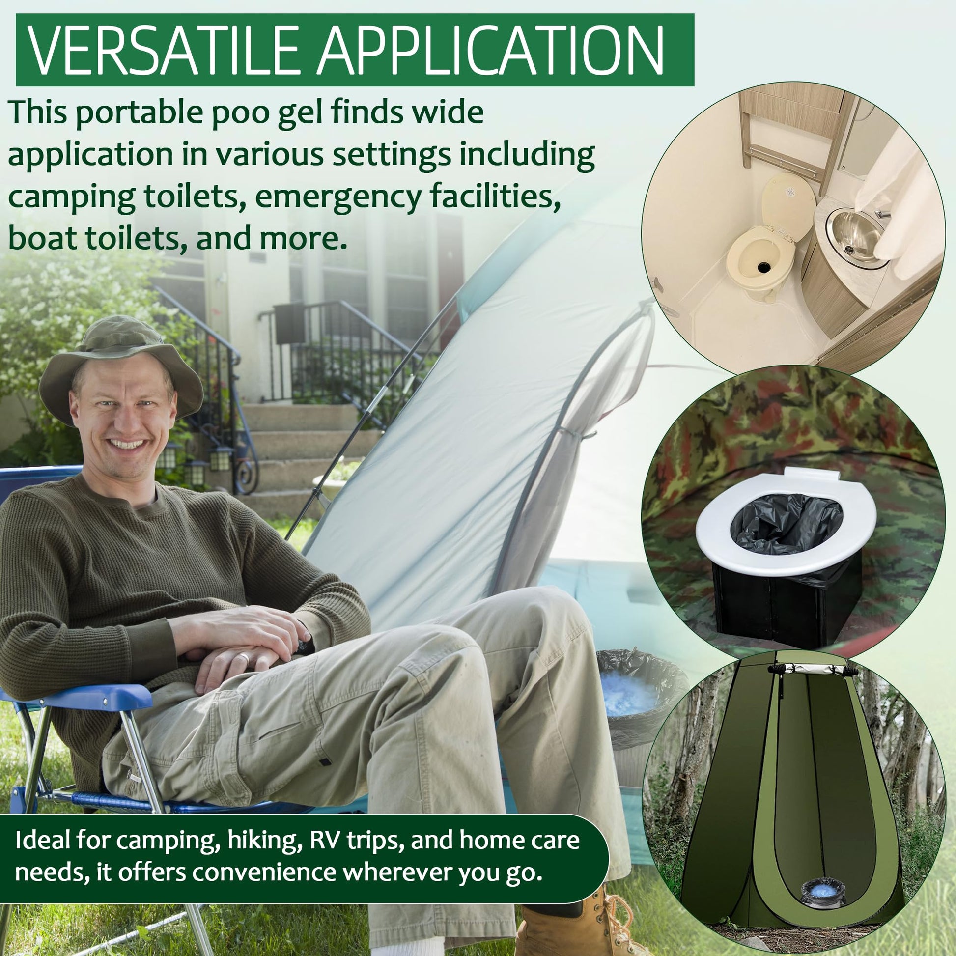 - VERSATILE APPLICATION - This portable poo gel finds wide application in various settings including camping toilets, emergency facilities, boat toilets, and more. Ideal for camping, hiking, RV trips, and home care needs, it offers convenience wherever you go.