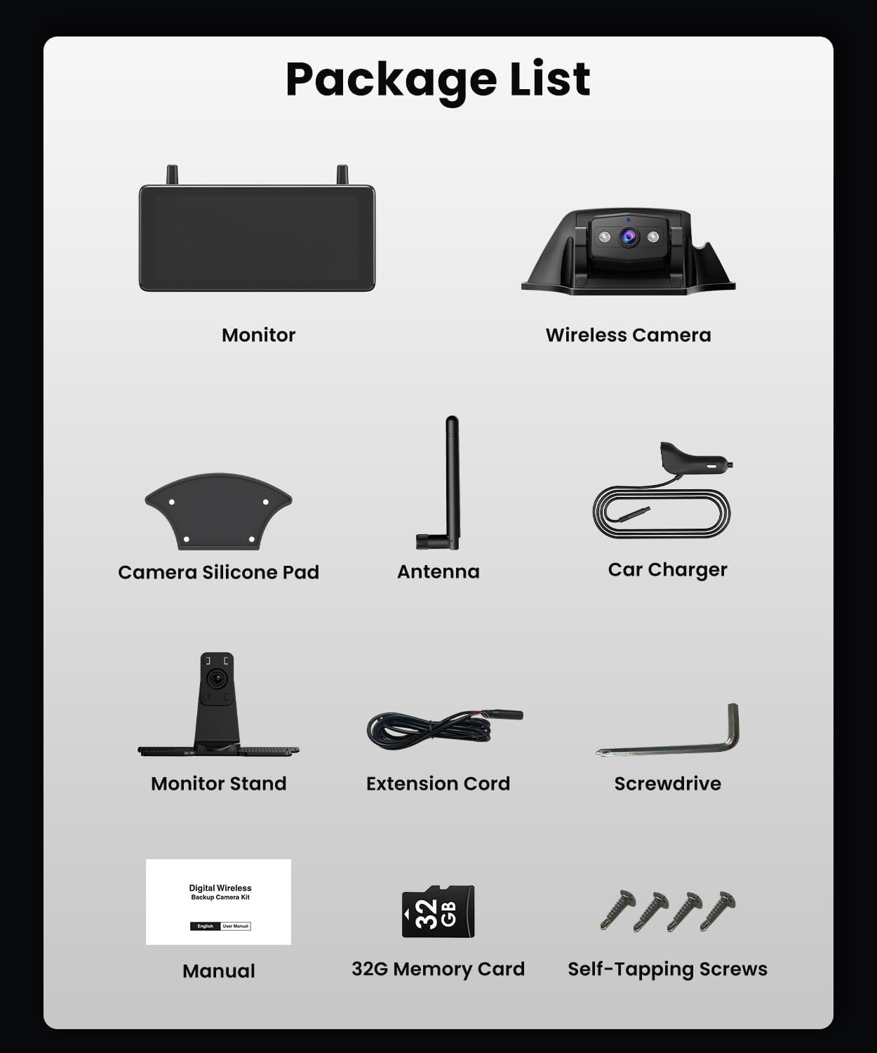 - DVR Recording Security: This RV backup camera wireless system records your journey (32G SD Card Included), capturing nighttime critter encounters and providing peace of mind while you sleep. Monitor your RV & surroundings for enhanced campsite security