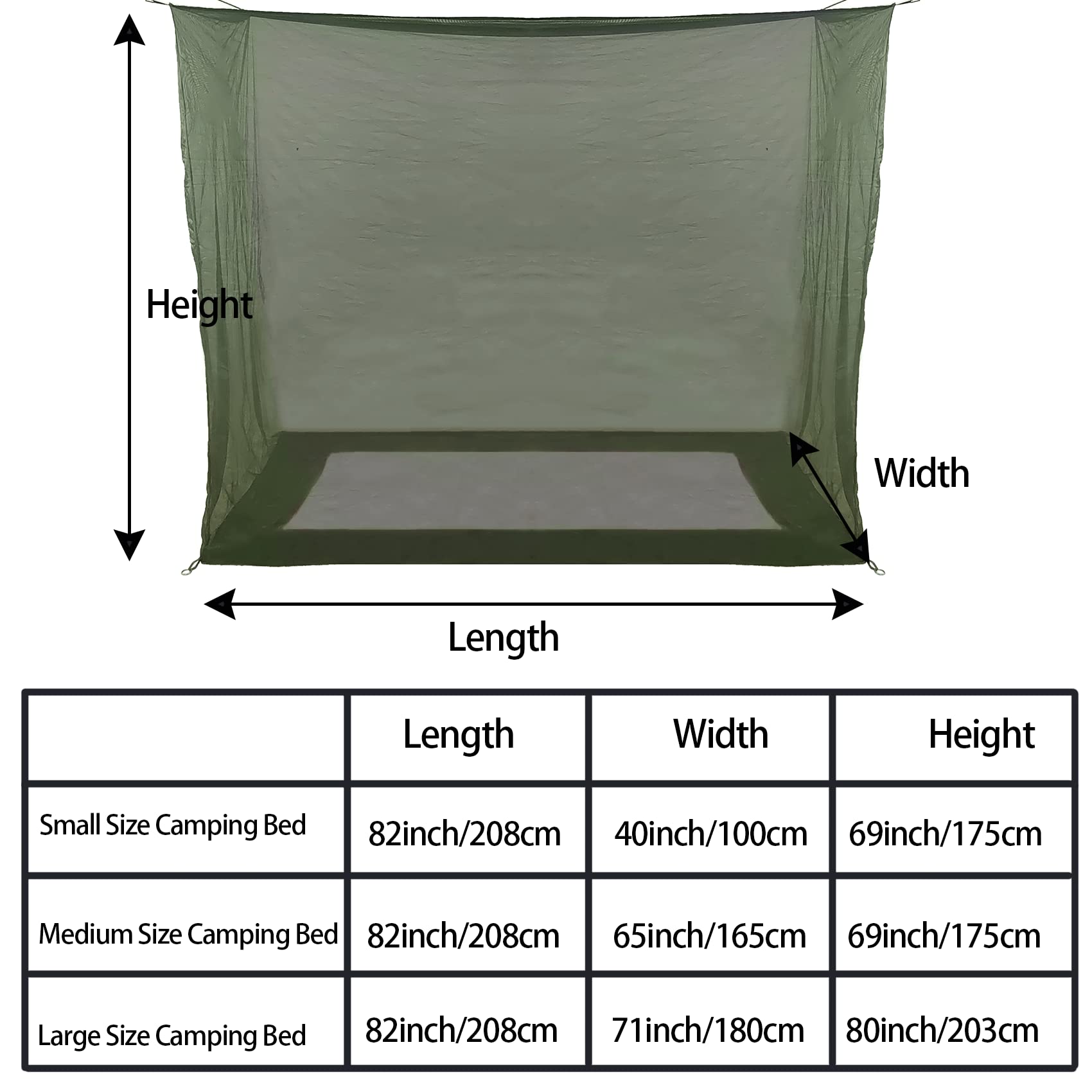 - Size Options: For small size camping beds 82” x 40” x 69” / 208cm x 100cm x 175cm; for medium size camping beds 82” x 65” x 69” / 208cm x 165cm x 175cm; for large size camping beds 82” x 71” x 80” / 208cm x 180cm x 203cm.