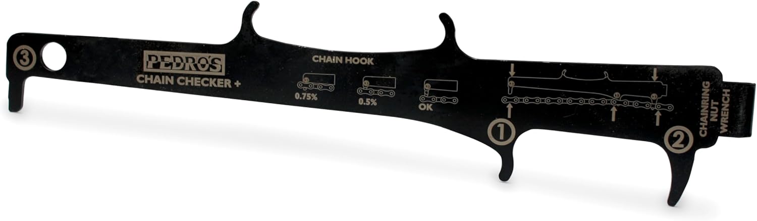 The Pedro's Chain Checker Plus II makes this task quick and easy offering a simple check of 0.5% and 0.75% chain wear. To ensure the maximum life from your chain and accuracy of measurement, the tool employs a three-point design which properly isolates pin wear from roller wear. Other two-point designs do not and can incorrectly indicate a worn chain, robbing the user of additional miles and money.