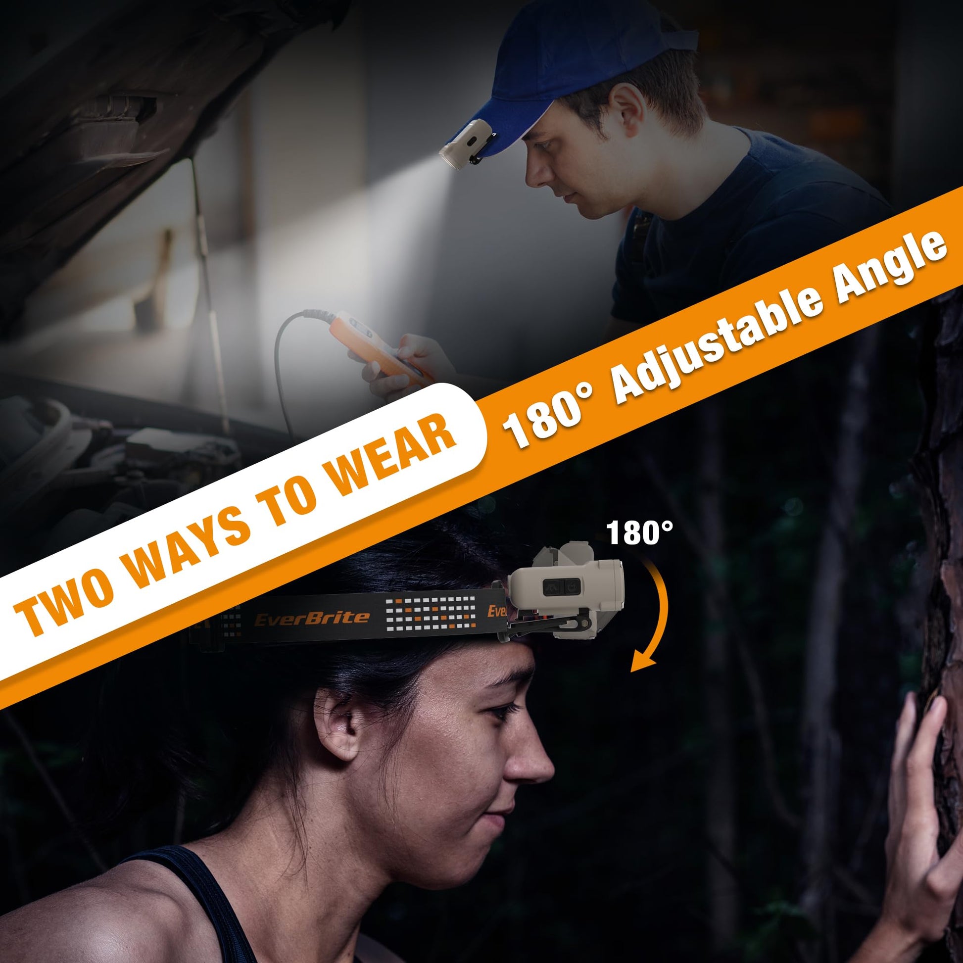 - HAT CLIP & WEAR ON HEAD – EverBrite Adjustable head lights for forehead support both clipping on hard hats/helmets or clothes and wearing on head, freeing your hands while playing or working on projects. 180-degree angle adjustment design lets you place light flexibly where you need it. The removable and washable headband is comfortable to wear for adults and kids.