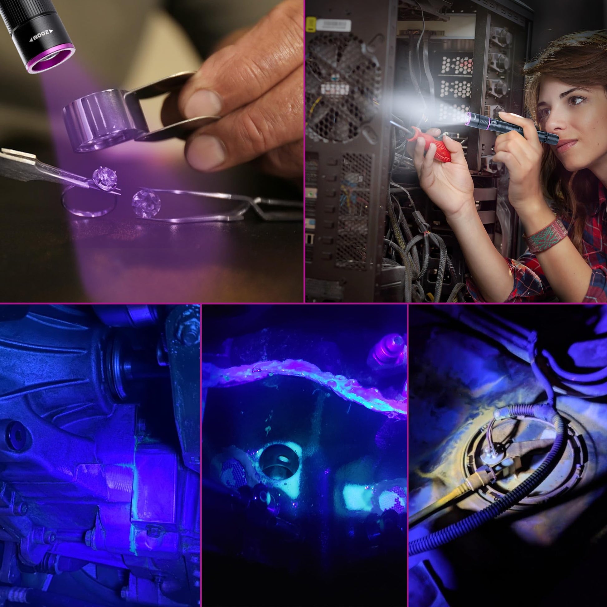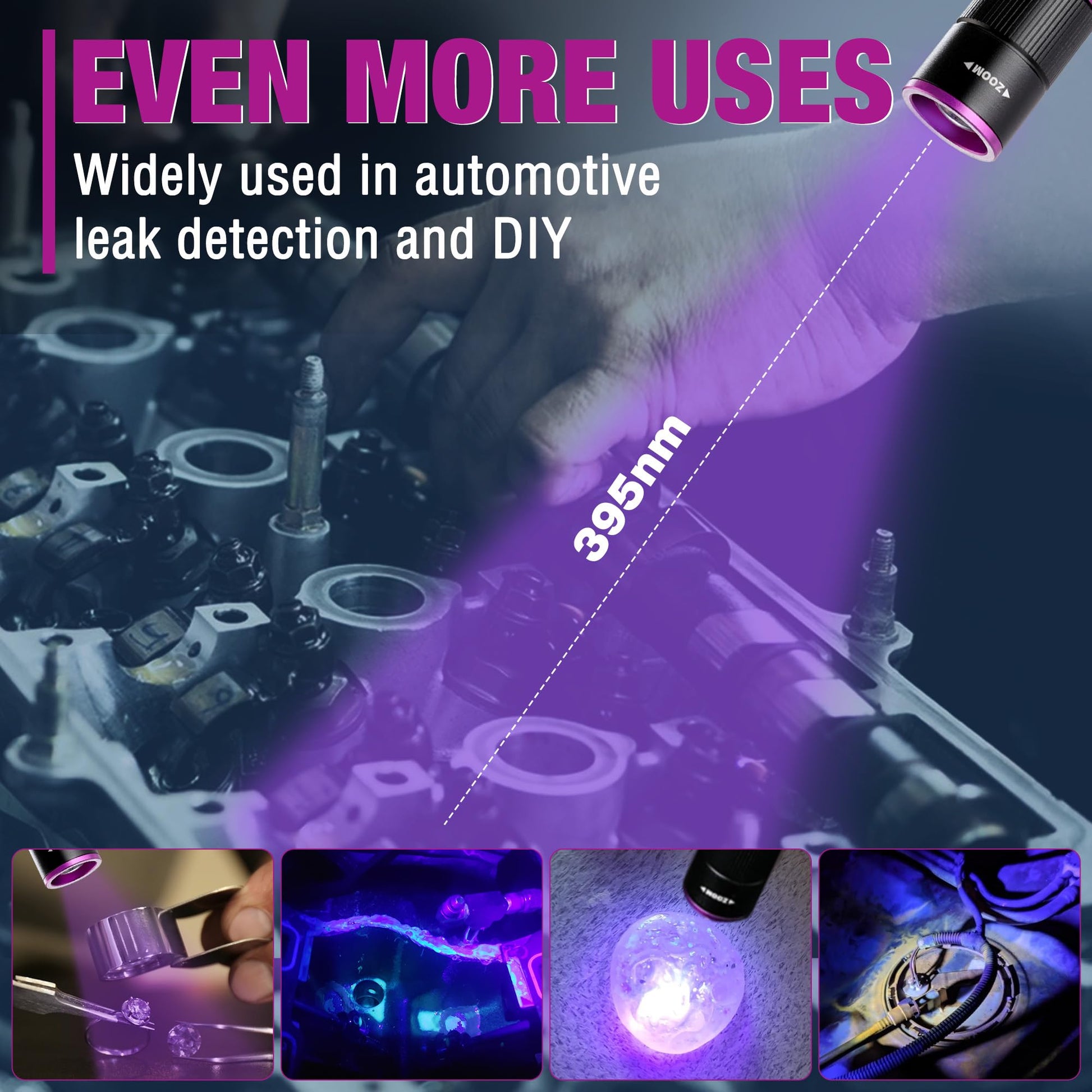 - 395nm UV Black Light: With a 395nm wavelength, this EDC flashlight can reveal what the naked eye cannot see, such as pet urine, scorpions, identity cards, passports, banknotes, and more. It's also ideal for DIY projects. The UV light rapidly cures UV resin, unlocking your creativity. Additionally, it can pinpoint the locations of air conditioning refrigerant and engine oil leaks by utilizing specific fluorescent leak detection dyes