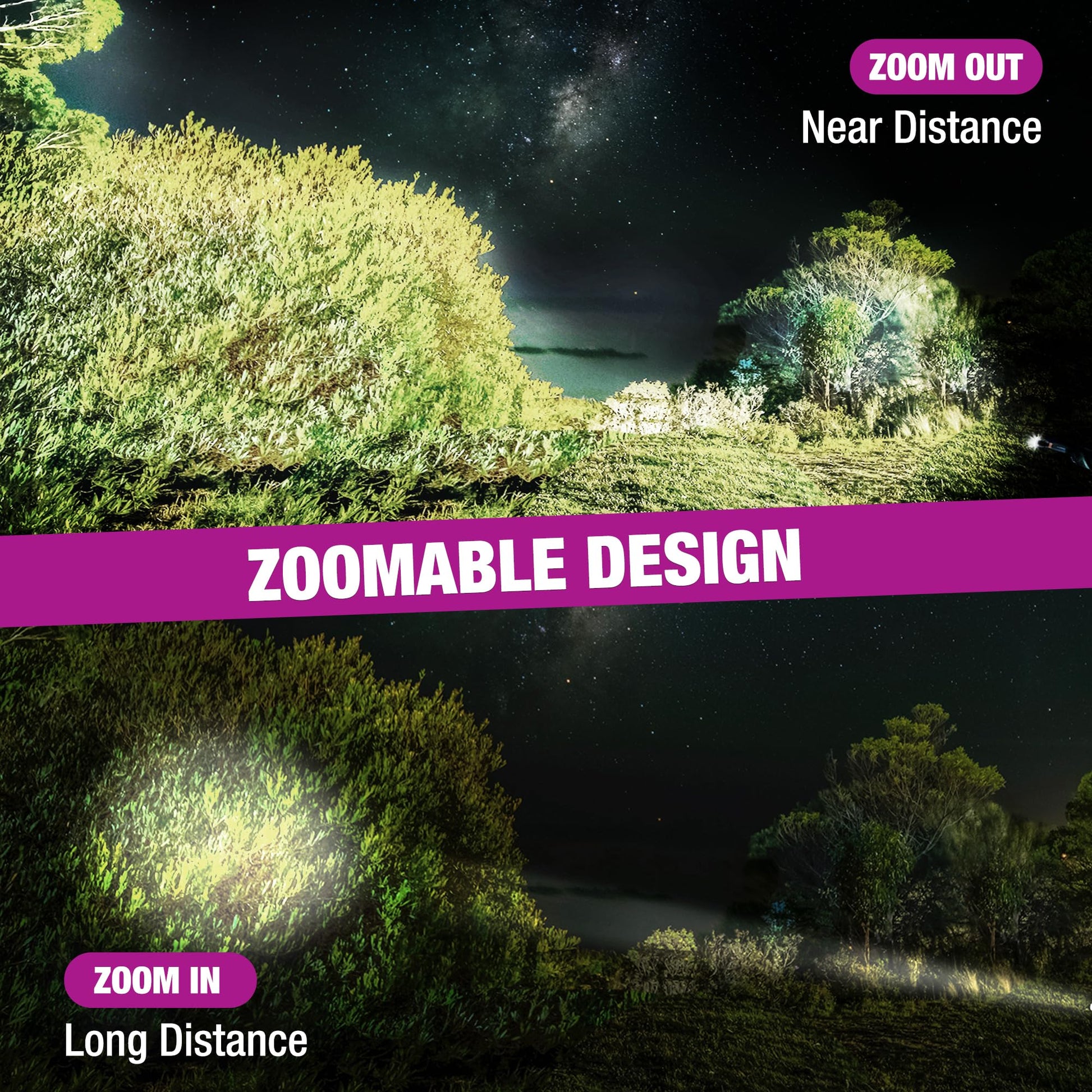 - 4 Lighting Modes & Zoomable Function: This LED flashlight has 4 light modes (high, low, strobe, UV light). Adjustable focus allows you to switch the beam size of this flashlight. It can be used either as a floodlight to provide adequate area lighting or as a strong spotlight for long-distance observation (White light reaches a maximum of 200 lumens)