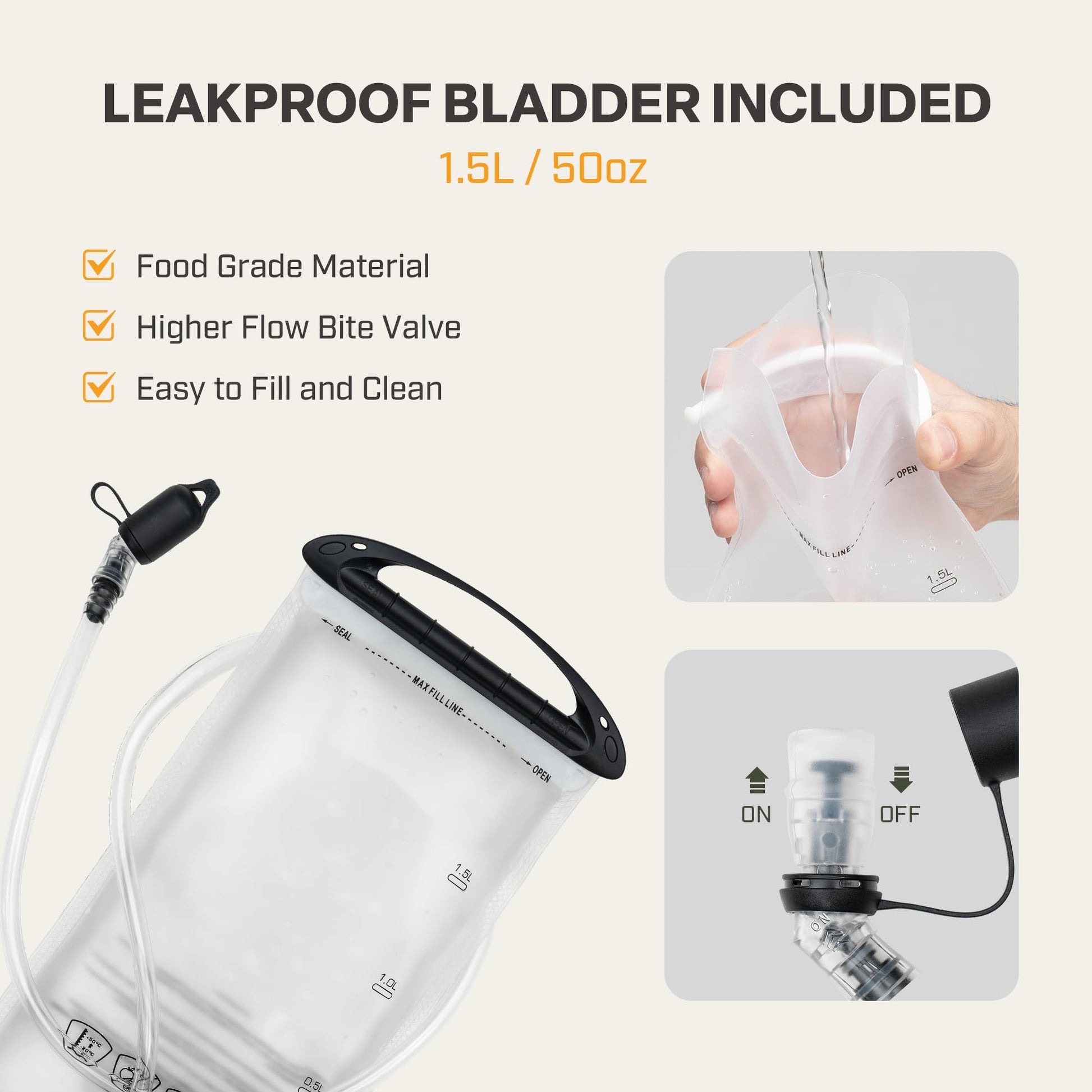 - Efficient Hydration System - The Included 1.5L leakproof hydration bladder is made from food-grade PEVA material. The 50oz reservoir offers quick water flow, provides enough water for a two hour ride. The ergonomic design, and high-flow self-sealing water delivery system make it easy to stay hydrated. The large opening of the reservoir also makes it simple to clean, designed for quicker loading and refilling.