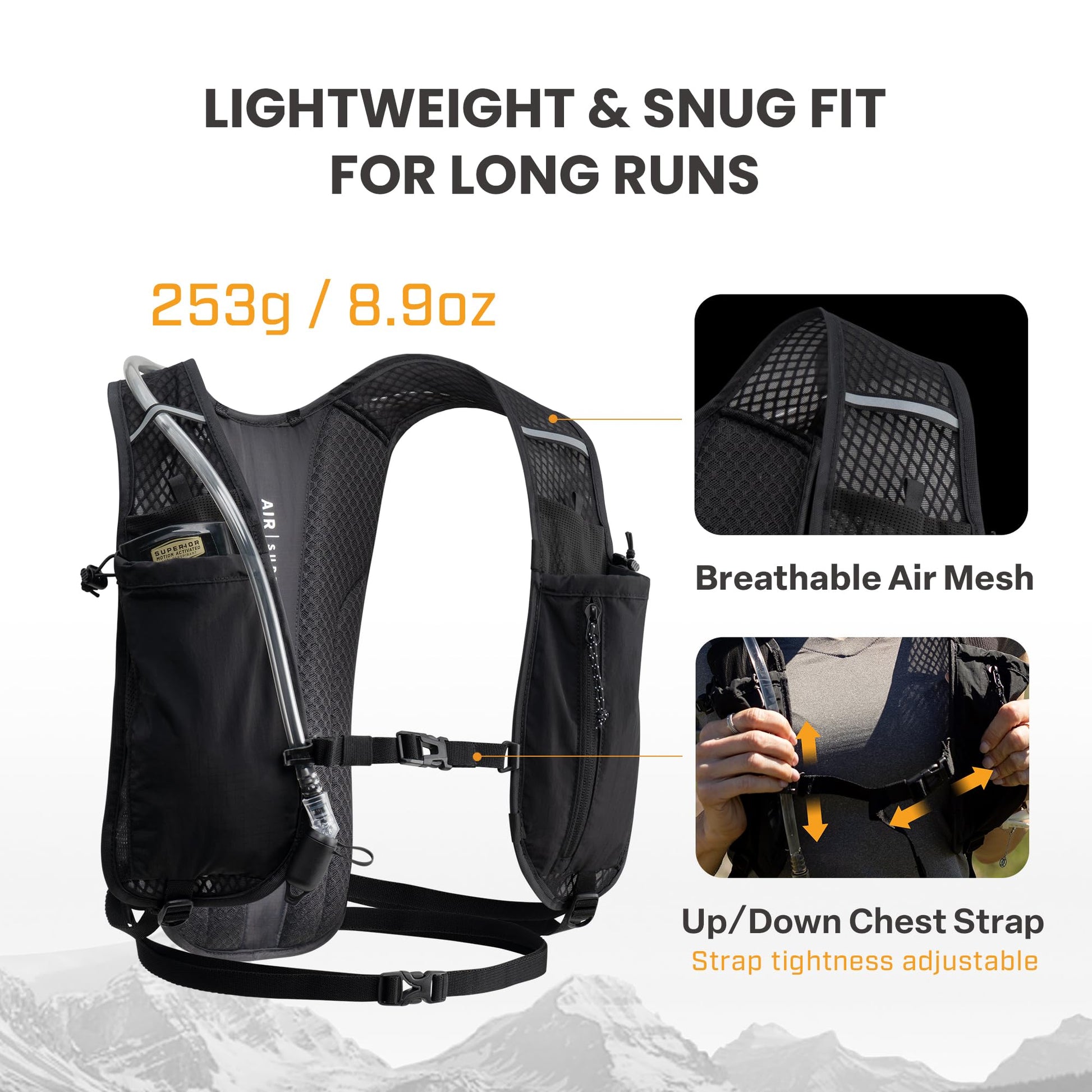 - Lightweight and Breathable Comfort: EVERFUN Hydration running pack weighing 253g(8.9oz), Size 16"*9.8"*3", this hydro backpack features an ergonomic design with 3D vent mesh harness that effectively keep your load light, providing a comfortable and supportive carrying experience. The ventilated shoulder straps are lightweight and breathable, ensuring your back stays dry during extended use.