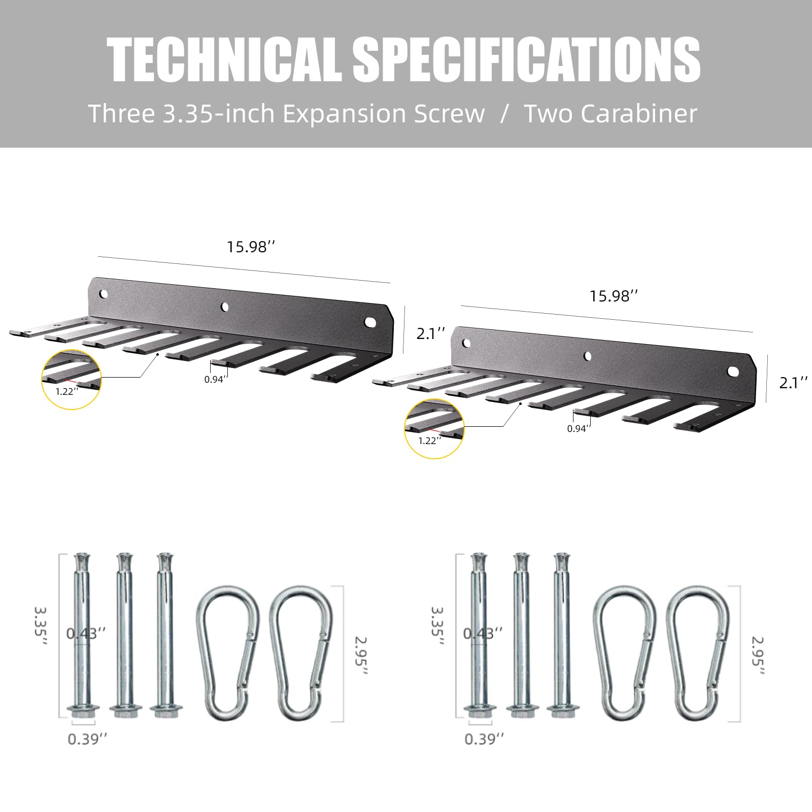 - 【Wall Mount Gym Storage Rack】Product Specification Assembled dimensions are 15.98" length x 5.74" width x 2.1" height. Mounting hardware and 2 safety hooks are included. Each prong is strong enough to hold 40 pounds at the wall side of the rack.