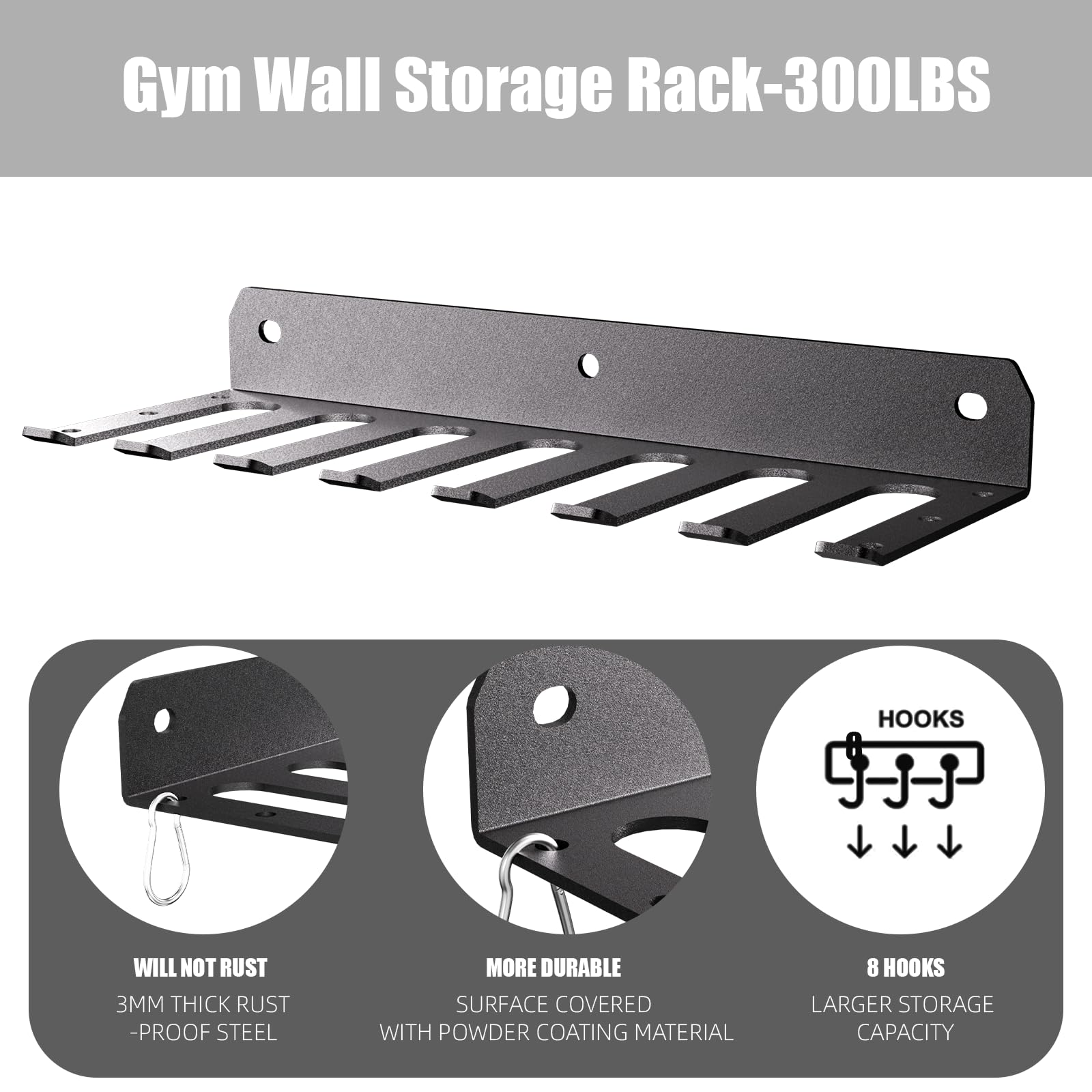 - 【Easy Installation Storage Rack】This home gym storage rack includes 3 x 3.35-inch screws, 2 safety hooks, The screw holes are spaced 16 inches apart to fit almost any wall.
