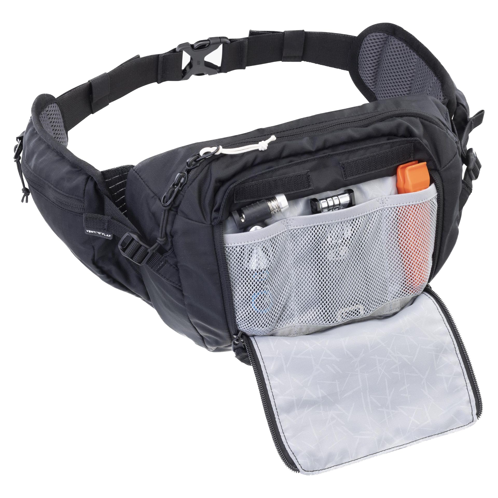 EVOC HIP PACK PRO 3, hip bag (AERO FLEX hip belt, AIR FLOW CONTACT SYSTEM, mesh material, tool pocket, hip bag, perfect for trail enthusiasts, universal size), Stone - Steel | Description: The EVOC HIP PACK PRO 3 hip backpack is the perfect companion for ambitious cyclists. It offers full freedom of movement thanks to EXTRA WIDE HIP WINGS and AERO FLEX hip belt. The AIR FLOW CONTACT SYSTEM ensures effective ventilation and maximum comfort thanks to large ventilation channels and mesh material on the back. The waist bag impresses with its practical organization: the FAST ACCESS TOOL COMPARTMENT provides immediate access to tools and the WIDE BACK POCKETS with large zippered pockets offer additional storage space. The bag is equipped with compression straps to adjust volume, back lock, key lock and other smart features. The bag is made of lightweight but durable recycled ripstop nylon with a PFC-free finish. The HIP PACK PRO 3 offers everything discerning cyclists need for their adventures: comfort, organization and performance in a compact design. | Features: - AIR FLOW CONTACT SYSTEM - AERO FLEX hip belt - VENTI FLAP - Tool storage pocket - Compression straps - Rear light clip - Key clip | Details: - Color: Stone - Steel - Size: One size | Manufacturer: We test all our products ourselves and work every day to make them even better. Our DNA is in every product and in everything we do we try to convey our passion for sports and travel. That's why EVOC products are always more than just equipment. EVOC stands for the development and concept of high-quality backpacks, bags and sports luggage with a special focus on uncompromising protection of people and materials - protect the things you love! Simply put: EVOC - PROTECTIVE SPORTS BACKPACKING