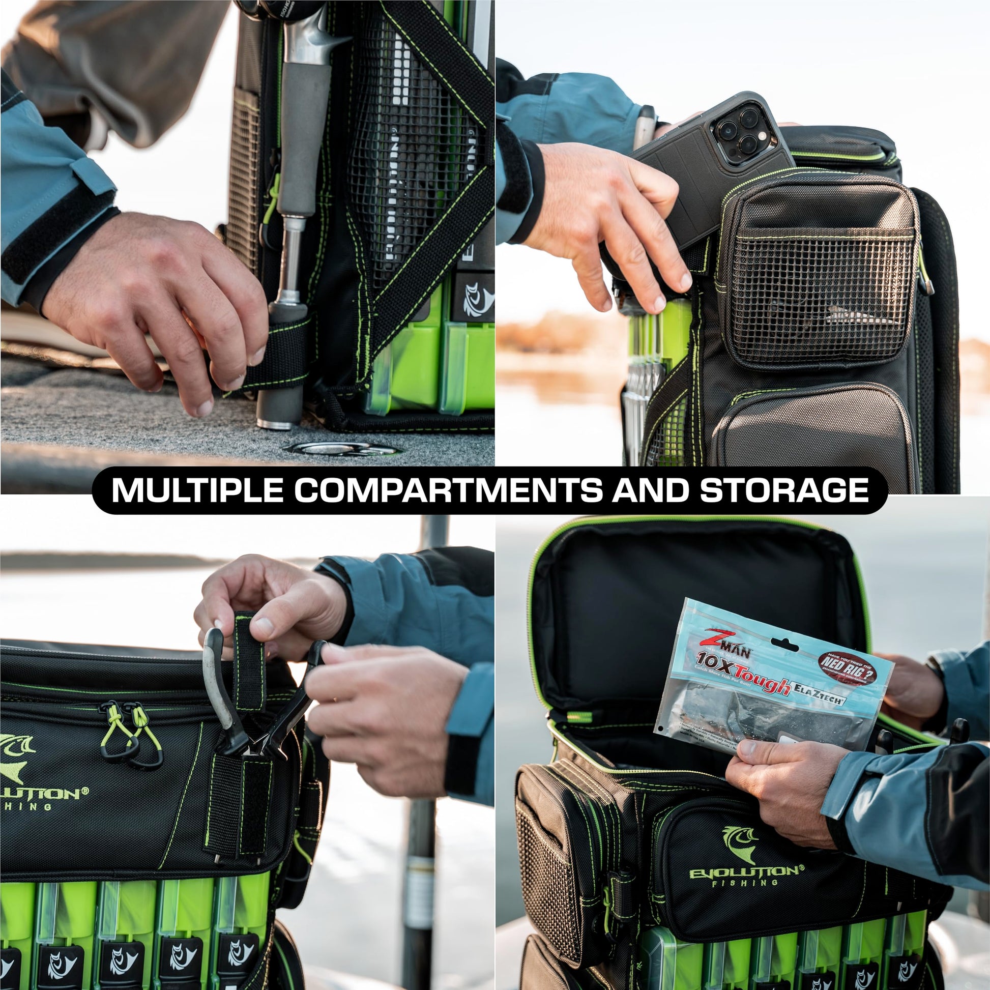 - Non-Slip Dimpled PVC Bottom; Built-In Line Spool Feed in Side Pocket