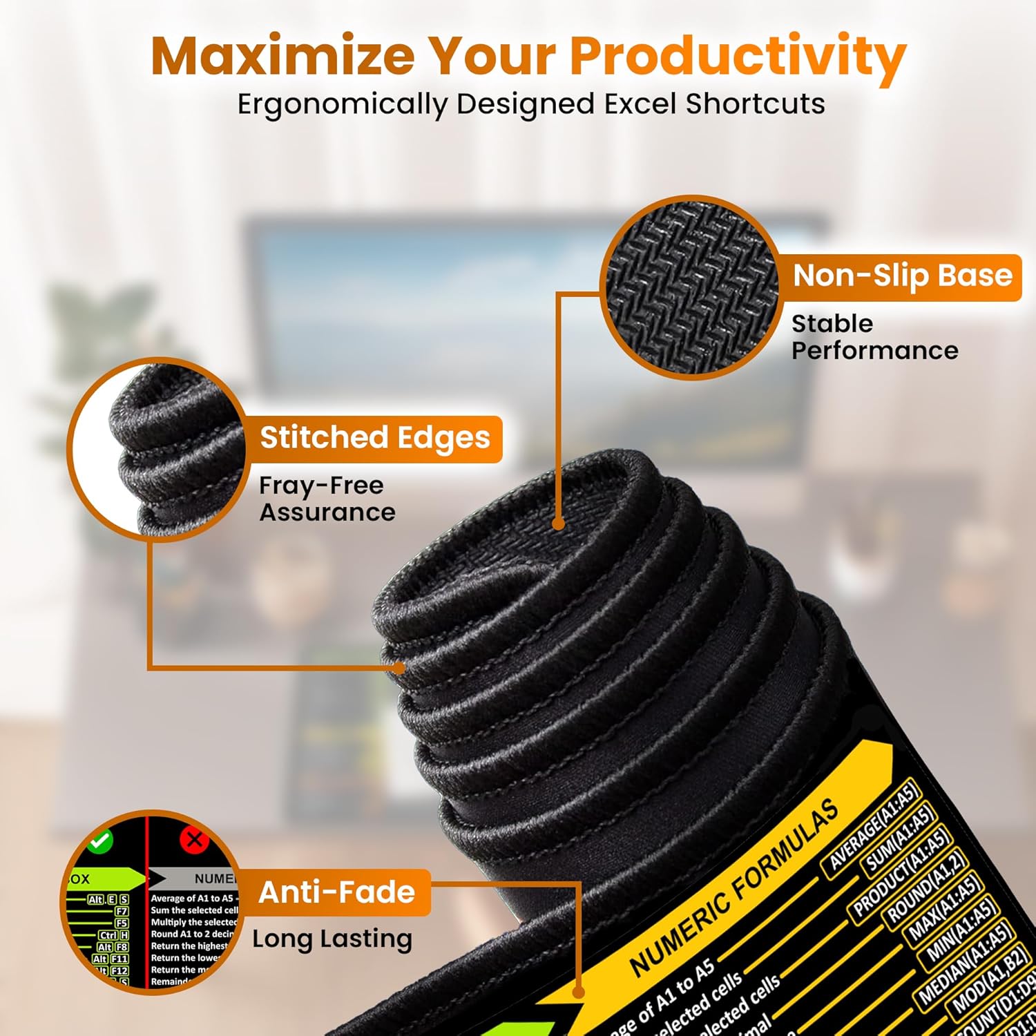 Excel Shortcuts Mouse Pad - Extended XL Office Keyboard Mat (31.5" x 11.8") Inch, Excel Mouse Pad Shortcuts, Stitched Edges | Non-Slip Base Excel Cheat Sheet Desk Pad
