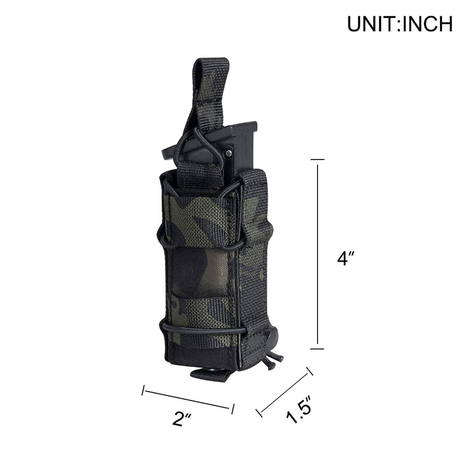Details: Suitable for M4 clip and pistol clip,can hold radios,flash bang and smoke grenades,magazine for GLOCK / M92 / 1911 / HK45. Also applies to a variety of multi-purpose tools, such as flashlight.Secured in place by elastic band, easy to adjust elastic band to keep different article reaches the most stable state. Product Information: Material: Nylon+Elastic Band Weight: 5.29 Oz Large One Size:3 In*1 In*4.5 In(L*W*H) Small One Size:2 In*1 In*4 In(L*W*H) Color: Black/Coyote Brown/Grey/Ranger Green/Multicam/Multicam-Black Note:This product doesn't contain magazine. Whether you are a professional gunfighter or just an amateur, it is ready to impress you with perfect design and superior.