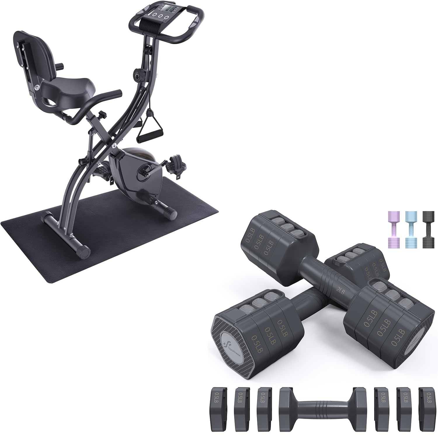 Details: Sportneer Fitness Bike gives you three types of indoor exercise bikes: Upright, Semi-recumbent and Recumbent foldable home workout bike. Additionally, this bike comes with arm resistance bands to help tone your upper muscles and provide a complete body workout. Sportneer dumbbells adjustable weight innovatively constructed itself with quick multi-weight adjustment that allows you to increase/decrease the weights quickly!
