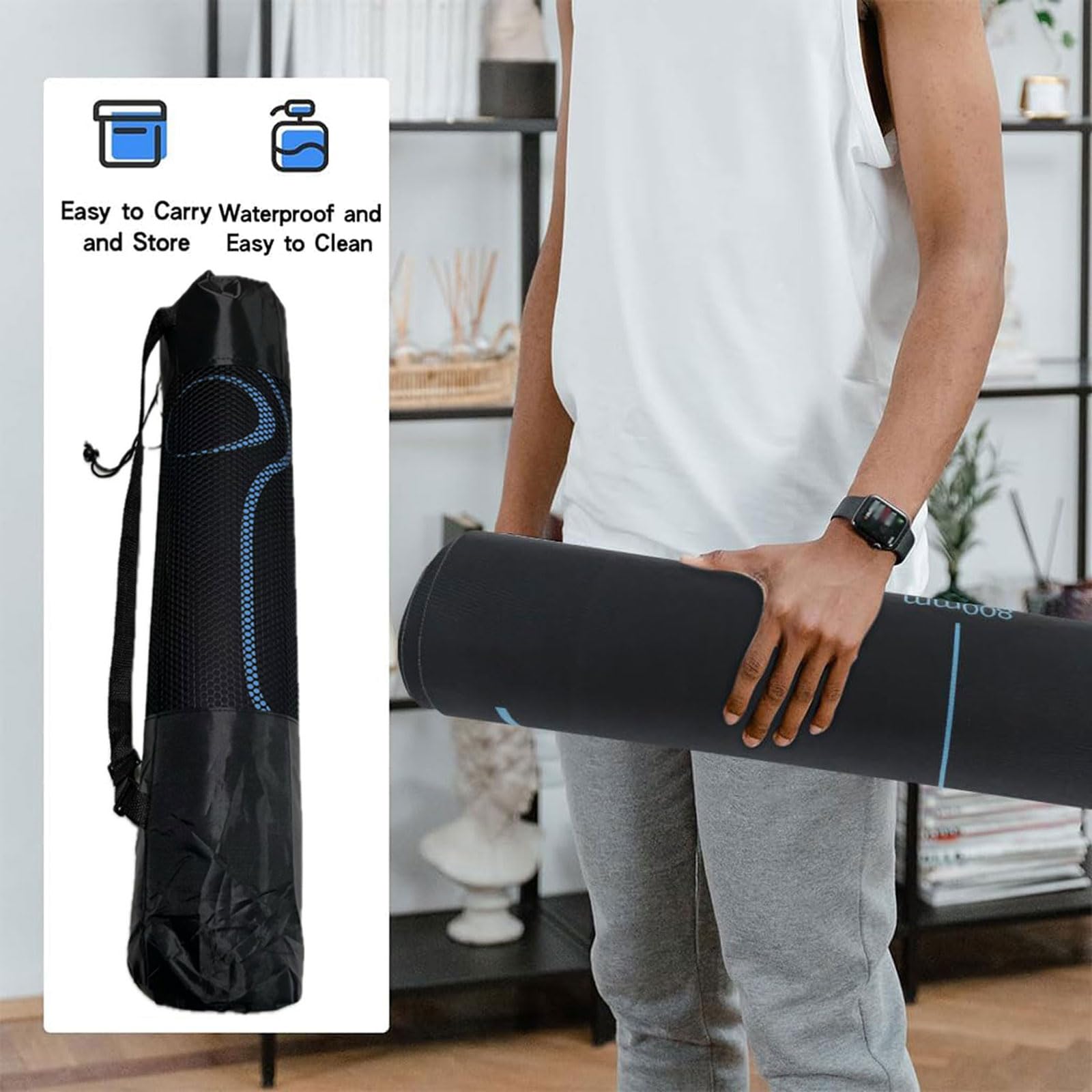 - Easy Cleaning: To clean your exercise mat, use a damp cloth, cold water, and mild detergent. Wipe it partially and then lay the stretching mat flat to air-dry.