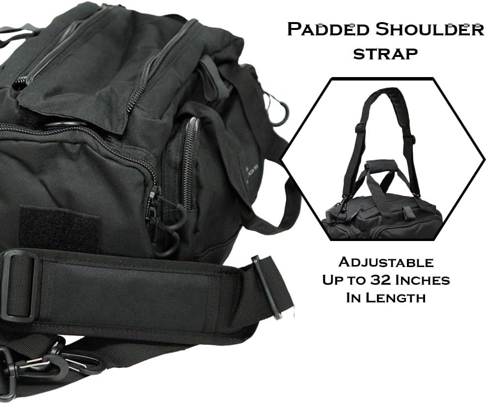 - HEAVY DUTY CONSTRUCTION: Crafted from weather-resistant 600 Denier polyester fabric, this shooting range bag ensures optimal protection for your gear. A dual zippered hook-and-loop opening on the tactical bag provides easy access to the main compartment.