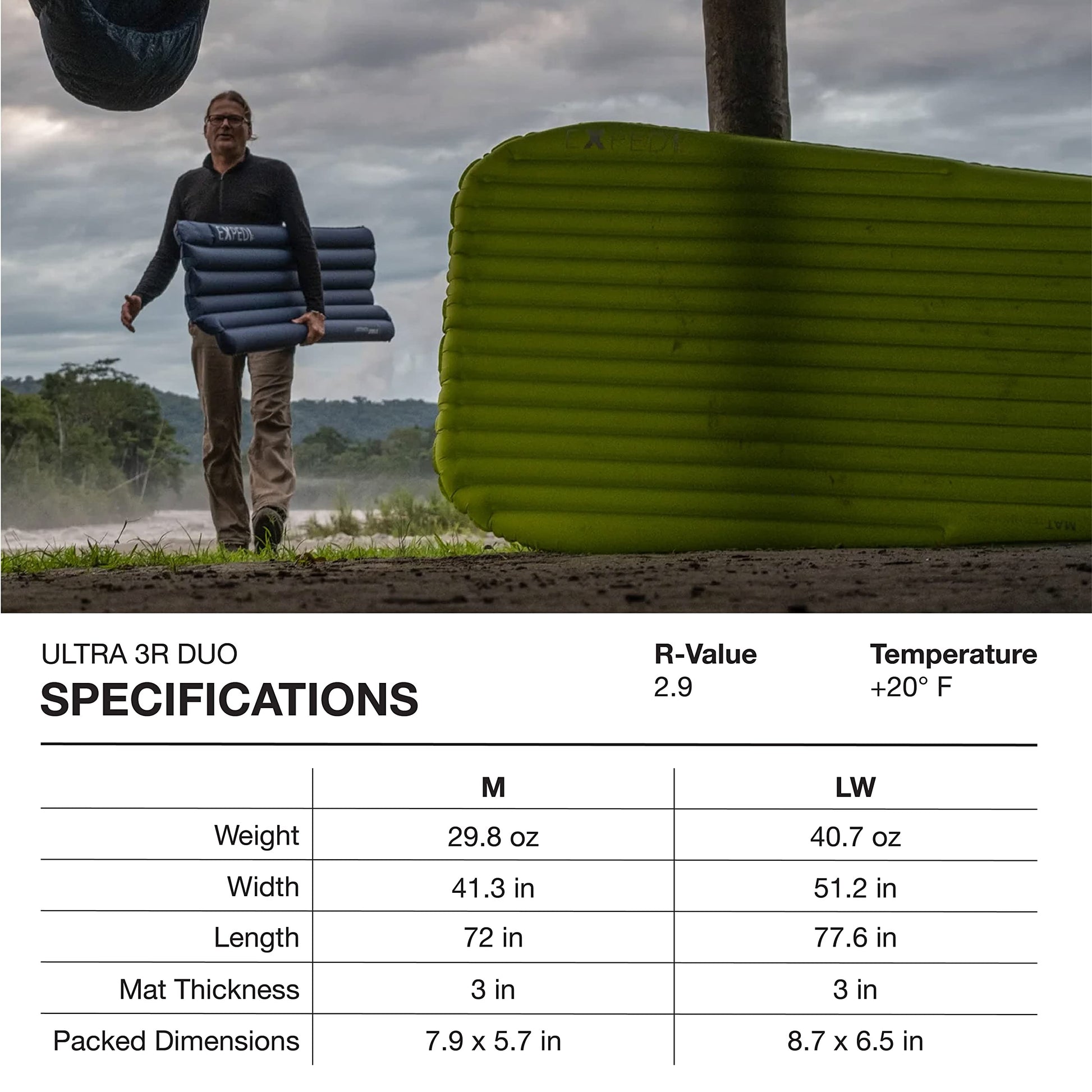 - Ultralight Backpacking Mat for Two - Made for three-season camping, Exped Ultra 3R Duo is a fast, compact, and lightweight sleeping pad perfect for your outdoor adventures